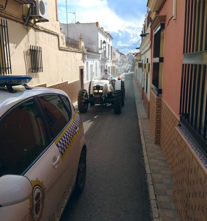 Por segunda vez en dos semanas el Ayuntamiento organiza y coordina los trabajos de desinfección general de todo el municipio, mediante la colaboración de varios agricultores del municipio, que aportan sus tractores para realizar dichas tareas.