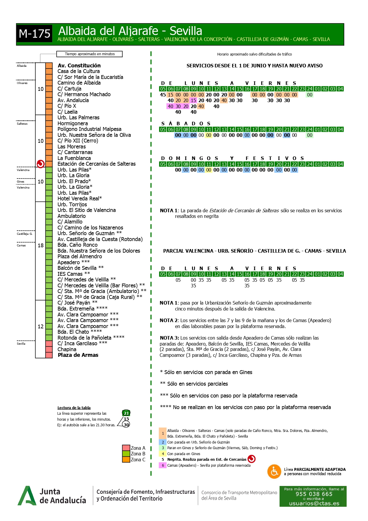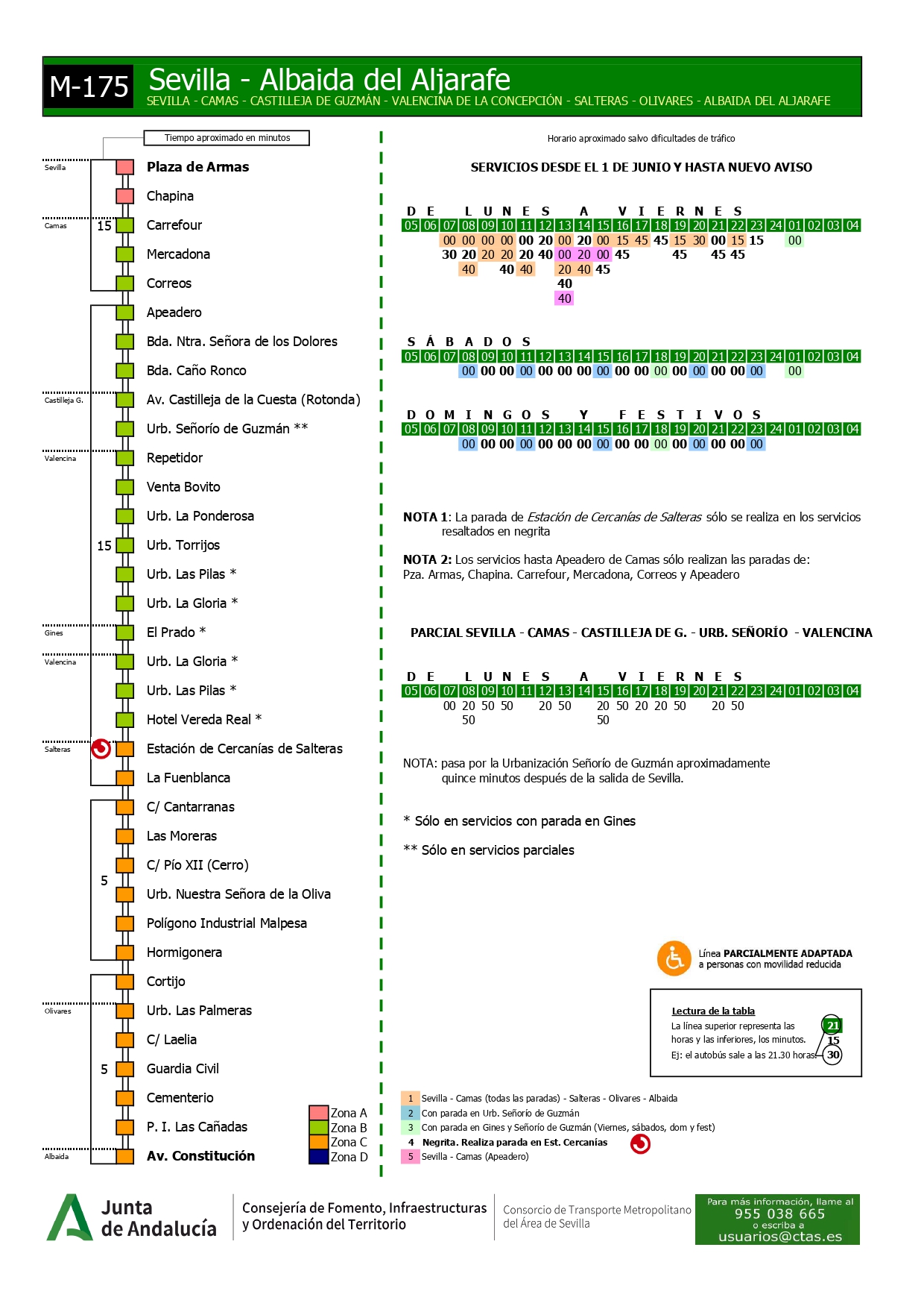 Desde el Consorcio de Transportes Metropolitano de Sevilla se ha comunicado oficialmente al Ayuntamiento de Olivares la entrada en vigor de los nuevos horarios de la Línea de autobuses M-175 (Sevilla-Camas-Salteras-Olivares-Albaida y viceversa), una vez ha cesado la vigencia del estado de alarma el pasado 9 de mayo.
