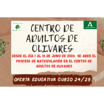 El proceso de matriculación para el Centro de Adultos de Olivares comienza el próximo 1 de junio y finaliza el 15 del mismo mes. El horario de atención al público es de 16:00 horas a 21:00 horas de lunes a jueves; y los viernes de 9:00 a 14:00 horas