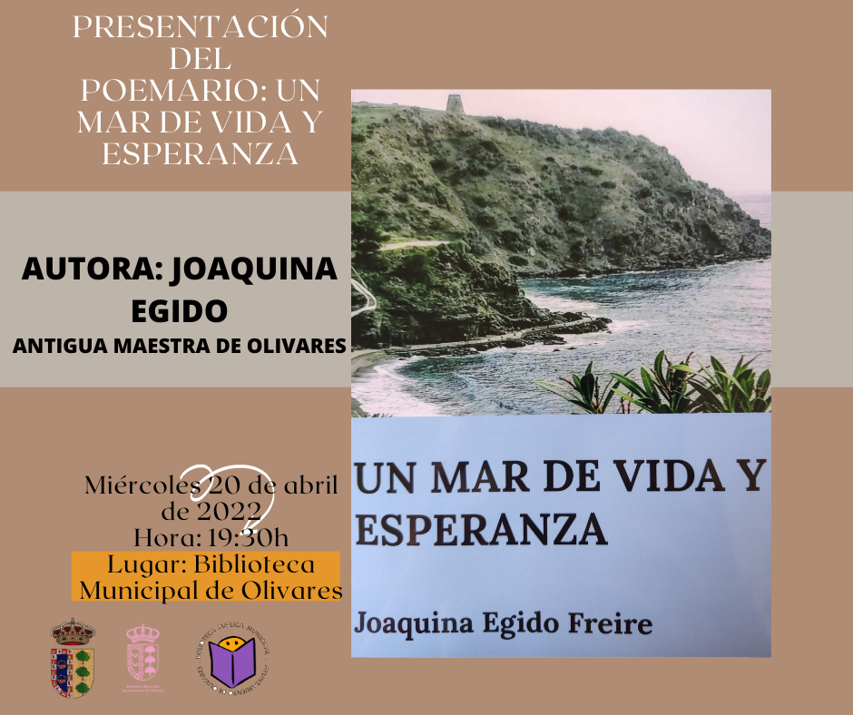 - La Biblioteca acogerá a las 19:30 horas, un recital poético a cargo de Joaquina Egido Freire, antigua maestra de Olivares. Los asistentes podrán adquirir su libro "Un mar de vida y esperanza", que la autora firmará en la Biblioteca.