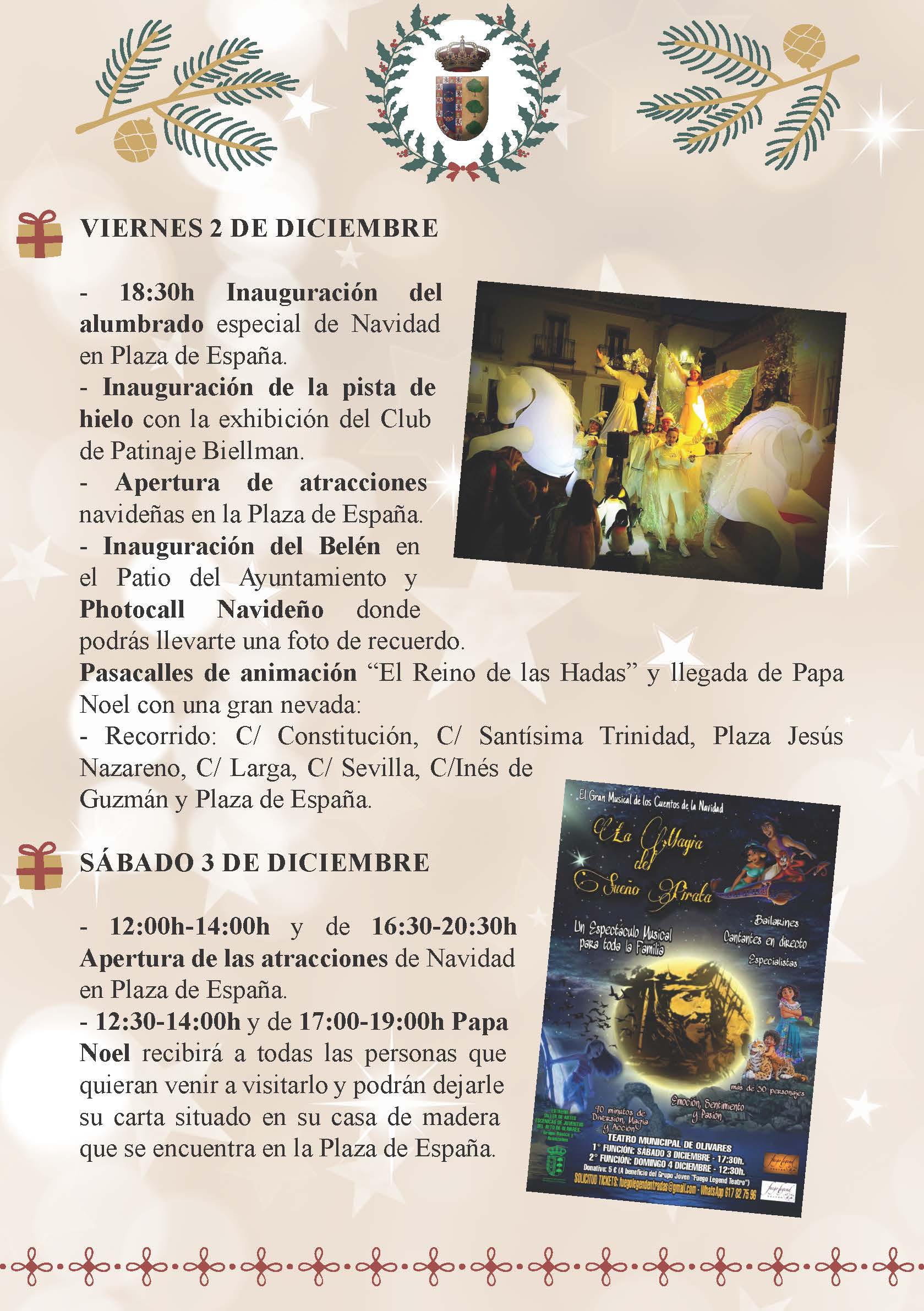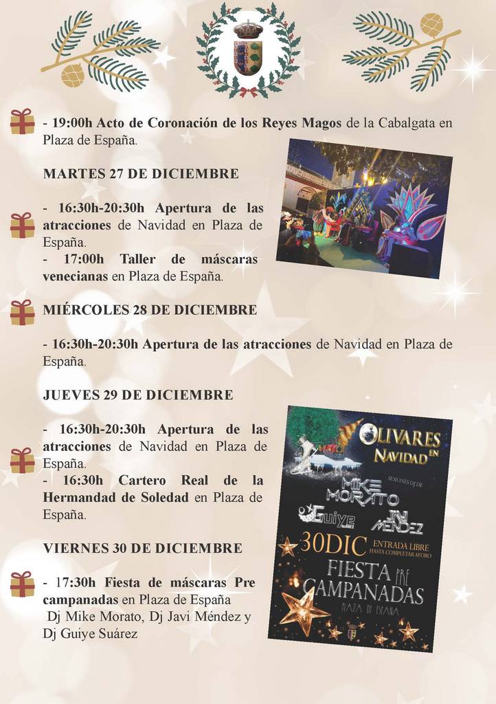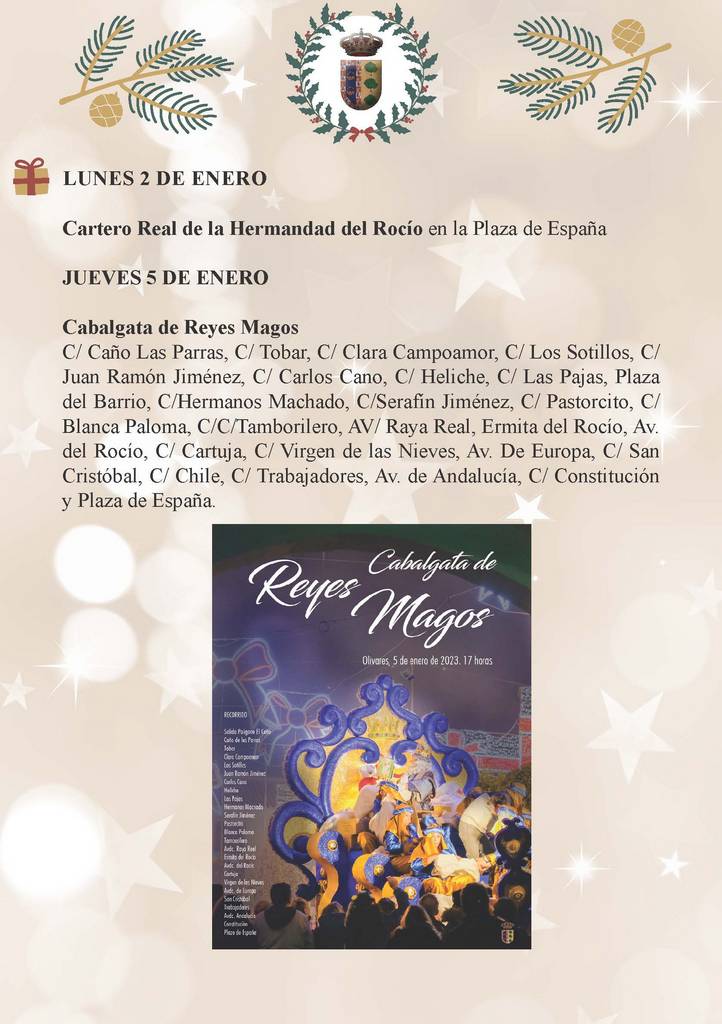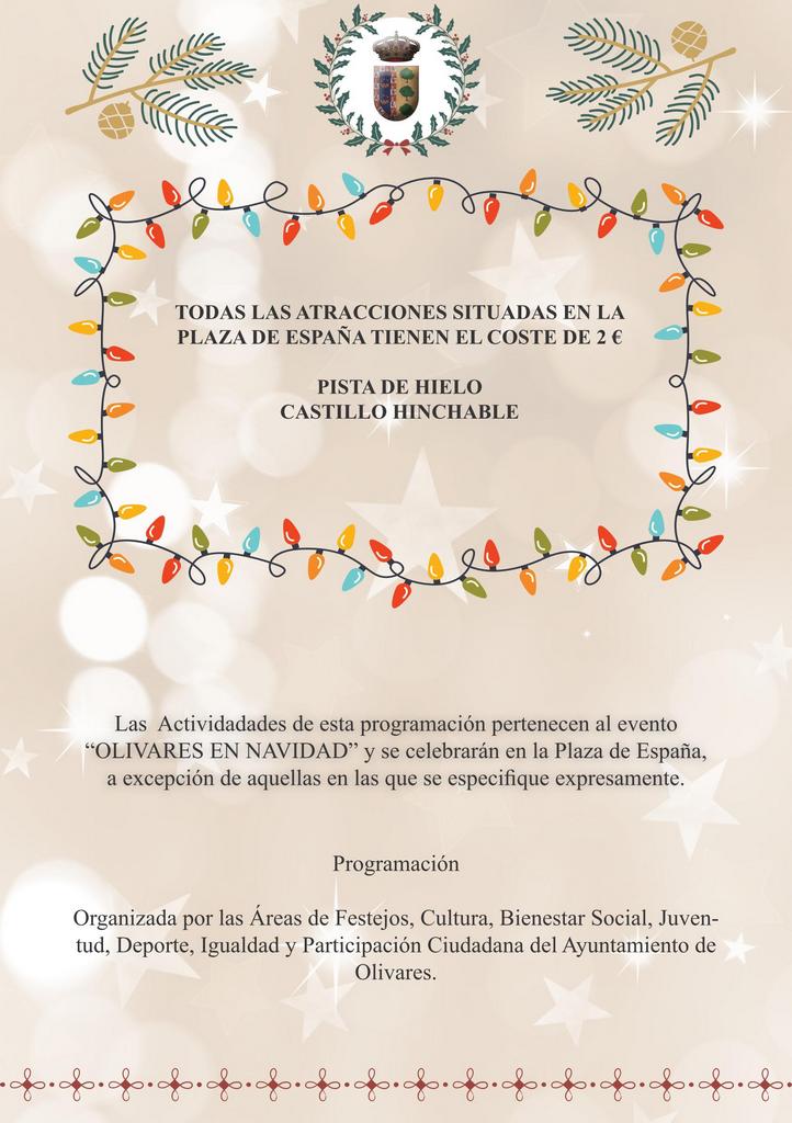 La delegación de Festejos del Ayuntamiento de Olivares lanza la programación que se desarrollará desde el viernes 2 de diciembre de 2022 al jueves 5 de enero de 2023 con motivo de la Navidad. Un amplio abanico de actividades para todos los público que en esta edición cuenta con algunas novedades.