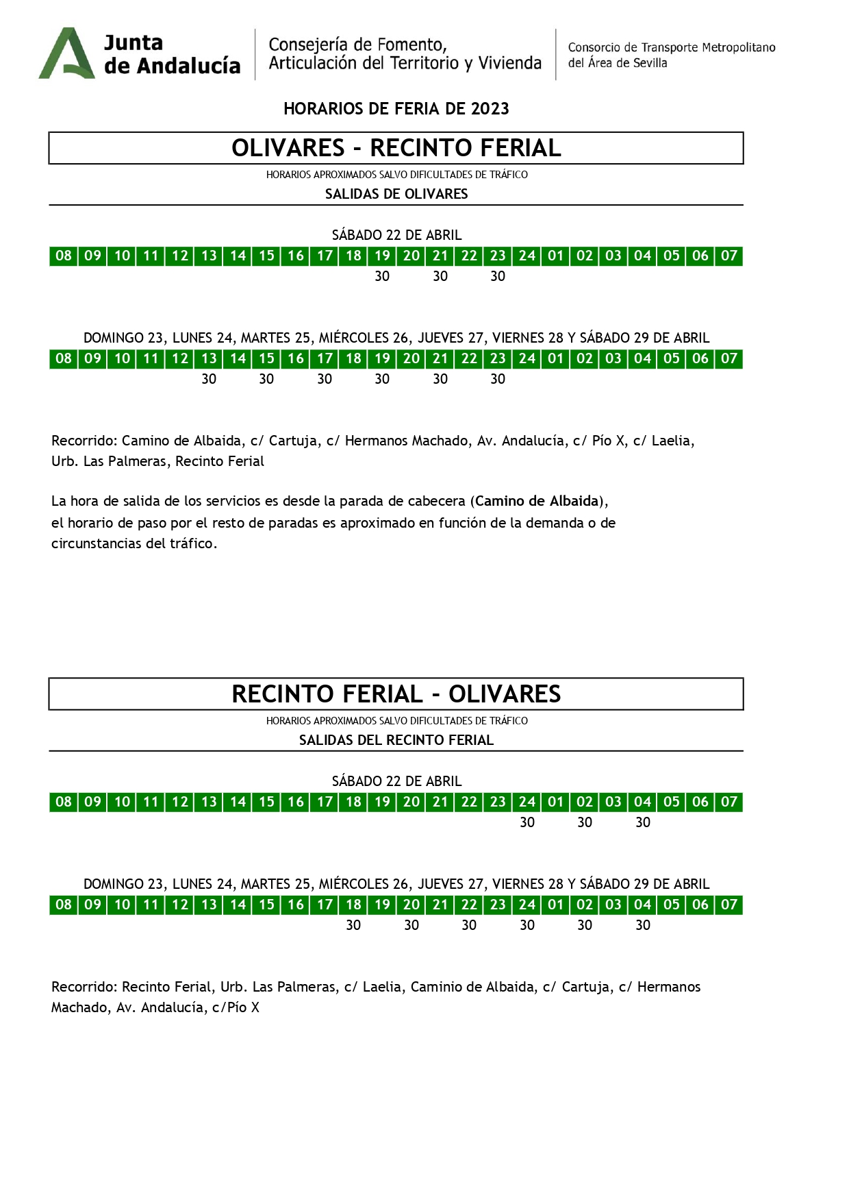 A.- Recorrido: Calle Camino de Albaida, Calle Cartuja, Calle Hermanos Machado, Avenida de Andalucía, Calle Pio X, Calle Laelia, Urbanización Los Vinos y Recinto Ferial de Sevilla.