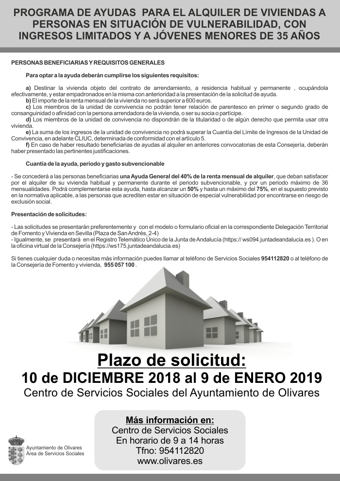 Si tienes cualquier duda o necesitas más información puedes llamar al teléfono de Servicios Sociales 954112820 o al teléfono de la Consejería de Fomento y vivienda, 955 057 100 .