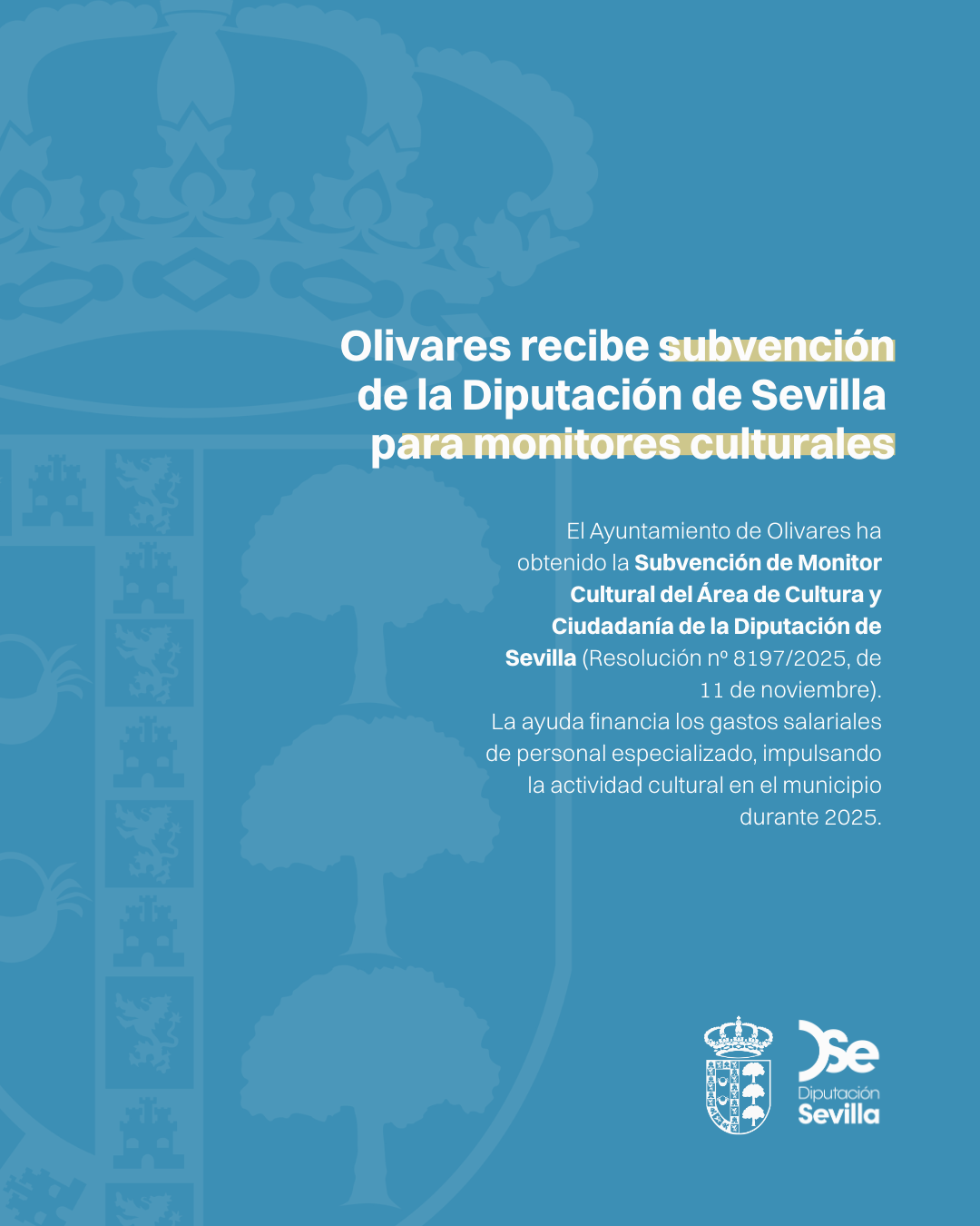 Otorgada al Ayuntamiento de Olivares la Subvención de Monitor Cultural del Área de Cultura y Ciudadanía de la Ecxma. Diputación Provincial de Sevilla en el año 2025 según resolución definitiva número 8197/2025 con fecha 11/11/2025.
