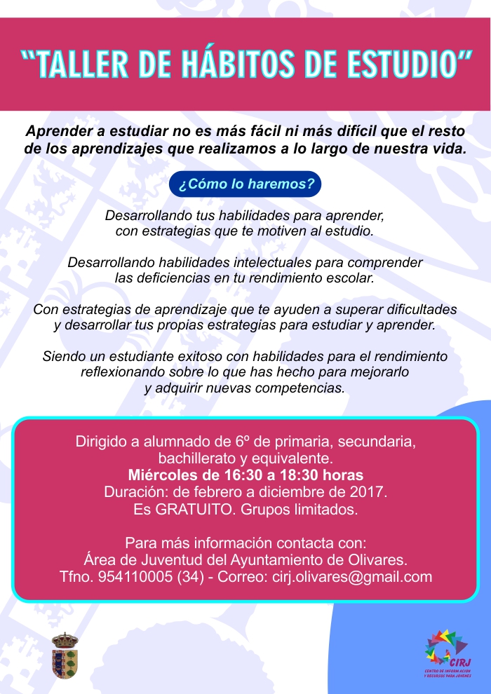 El Área de Juventud del Ayuntamiento de Olivares pone en marcha una nueva edición del taller de Hábitos de Estudio y Mejora del rendimiento Académico. Las sesiones de trabajo tienen un carácter eminentemente práctico, y va dirigido al alumnado de secundaria, bachillerato y equivalente, atendiendo a una demanda actual de estudiantes para rentabilizar su tiempo de estudio, mejorar su rendimiento académico, la atención plena y mejorar nuestra forma de comunicarnos.