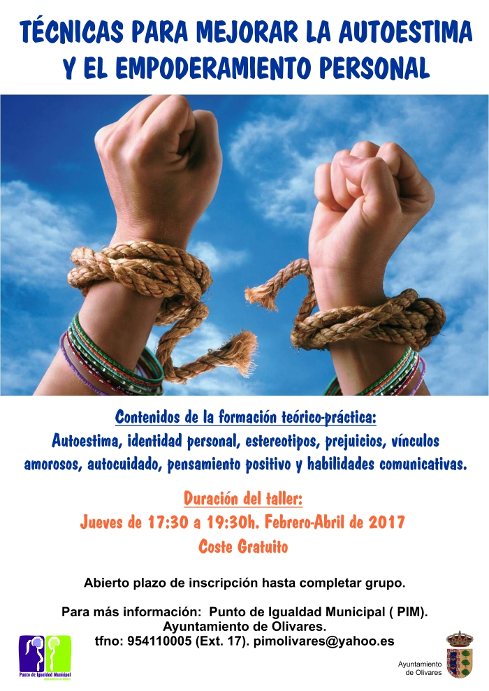 El Punto de Igualdad Municipal (PIM) abre plazo de solicitud, para el Taller práctico de Técnicas para mejorar la autoestima y el empoderamiento personal, dentro de su programación de actividades para el año 2017.