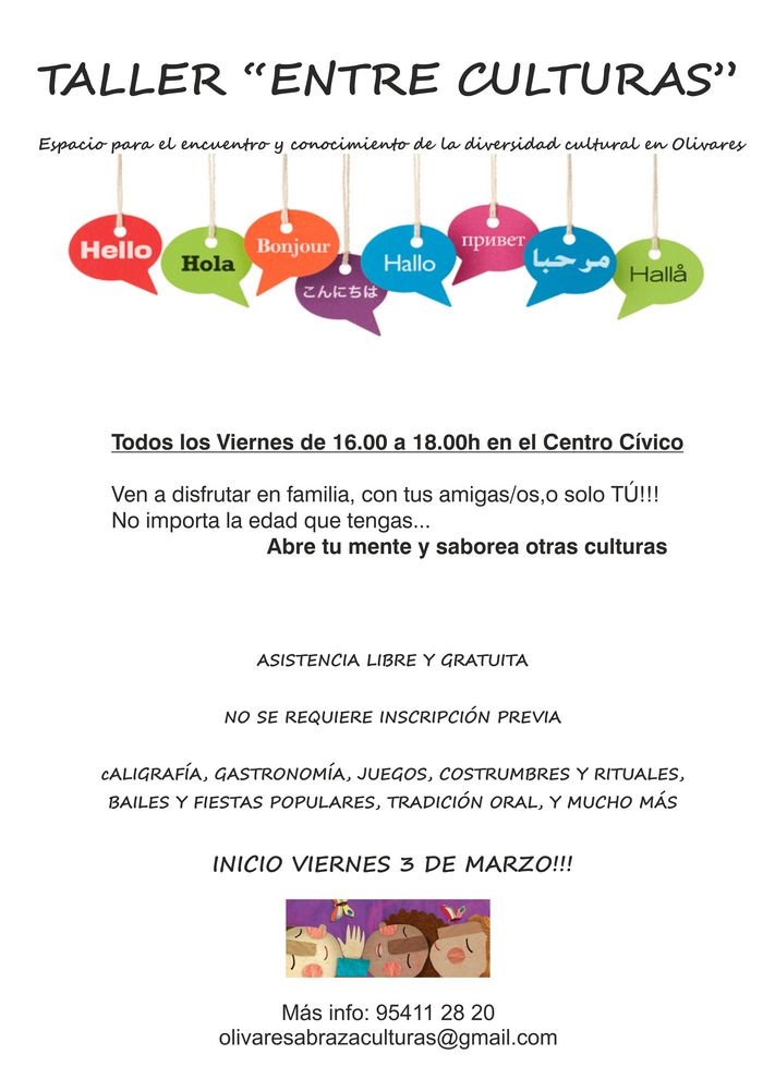 Con el fin de crear un espacio de encuentro intercultural para el conocimiento de las diferentes culturas, que en la actualidad suman más de 20 nacionalidades diferentes en Olivares, y experimentar la riqueza del intercambio de experiencias y elementos culturales el Área de Bienestar Social del Ayuntamiento de Olivares promueve un taller dirigido a la población en general con el fin de tratar la diversidad cultural y sus beneficios en nuestro pueblo.