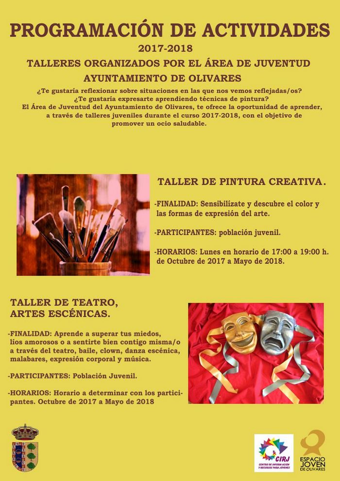 ¿Te gustaría reflexionar sobre situaciones en la que nos vemos reflejadas/os? ¿Te gustaría expresarte aprendiendo técnicas de pintura? El Área de Juventud del Ayuntamiento de Olivares te ofrece la oportunidad de aprender a través de talleres juveniles durante el curso 2017/18 con el objetivo de promover un ocio saludable.