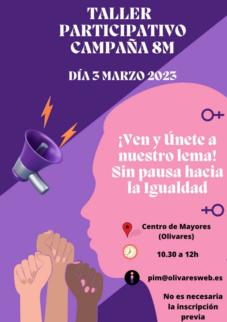 El próximo día 3 de Marzo en horario de 10:30 a 12:00h en el Centro de Mayores, tendrá lugar el taller participativo: “Sin Pausa hacia la Igualdad”, con motivo de la campaña de sensibilización 8M; una actividad que tiene como objetivo la reflexión sobre los logros conseguidos, y “prioritarios por conseguir”, en pro de una sociedad igualitaria.