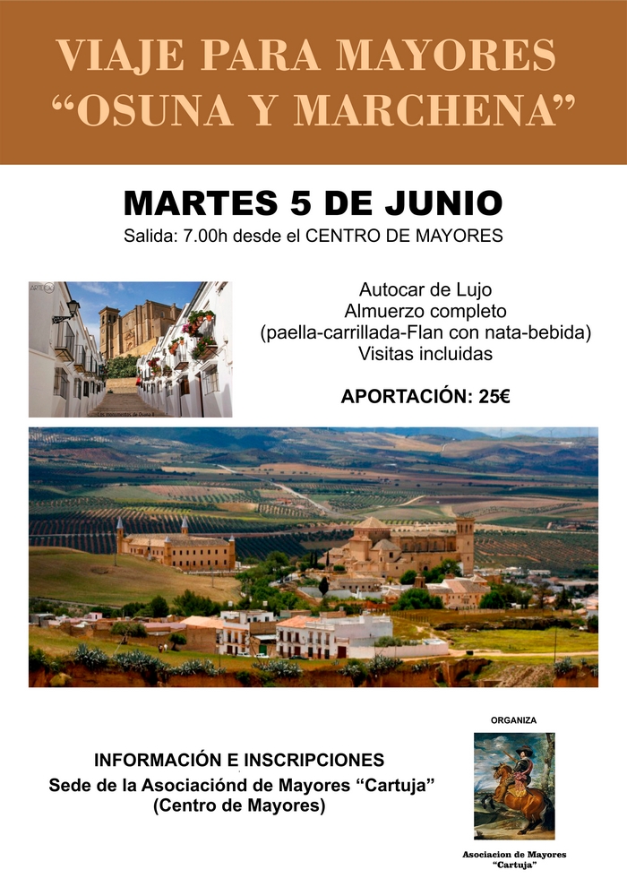 La Asociación de Mayores "Cartuja" está organizando para las personas mayores de Olivares una visita a dos pueblos sevillanos, Osuna y Marchena para el martes 5 de junio.