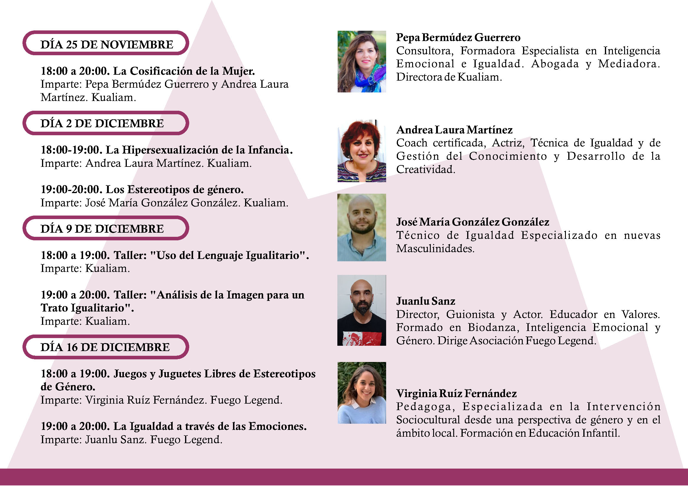 Dirigida a profesionales, personal educador y familias. Población juvenil y adulta. Días 25 de Noviembre, 2, 9 y 16 de diciembre de 2020. Horario: 18 a 20h.