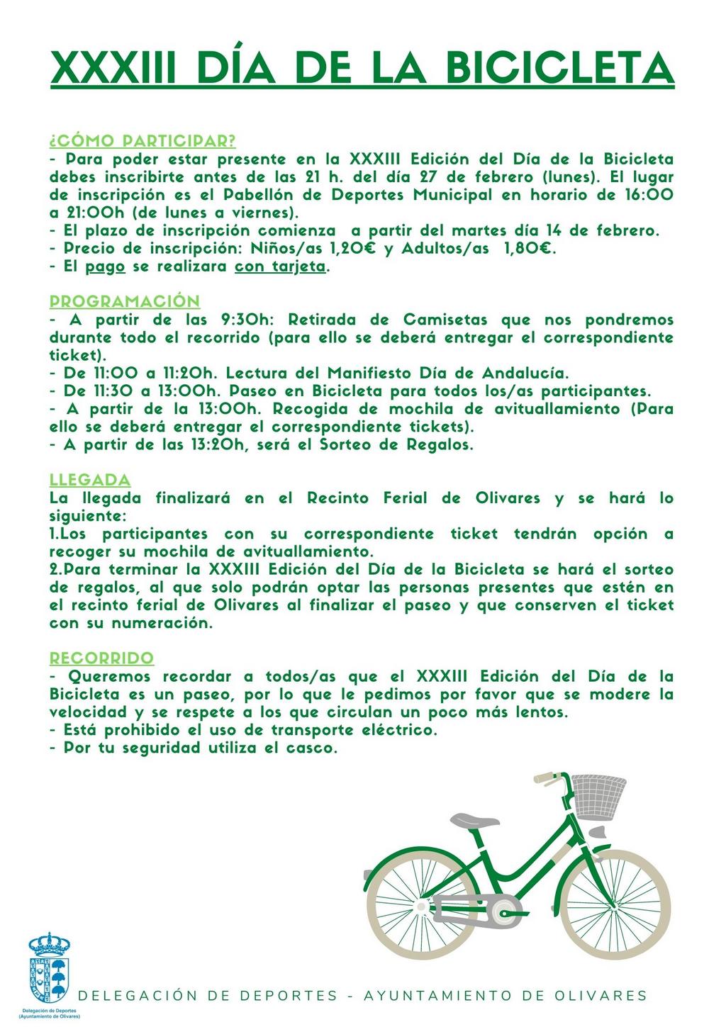 2.Para terminar la XXXIII Edición del Día de la Bicicleta se hará el sorteo de regalos, al que solo podrán optar las personas presentes que estén en el recinto ferial de Olivares al finalizar el paseo y que conserven el ticket con su numeración.