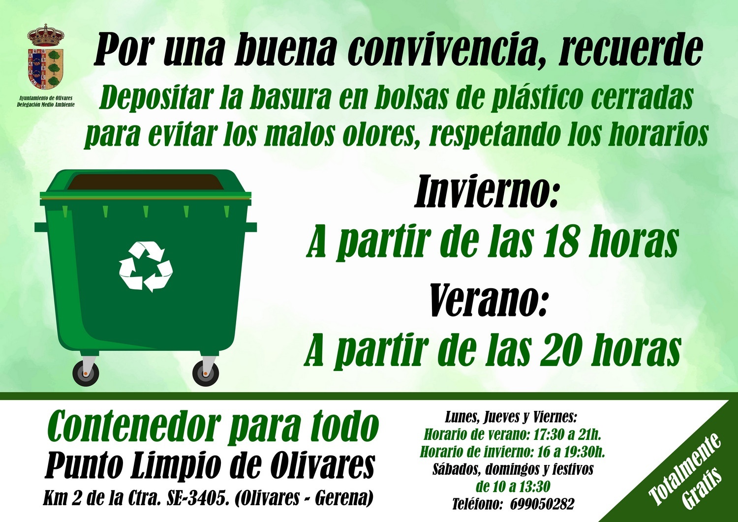 La Mancomunidad Guadalquivir dispone de un “teléfono de la limpieza” 955700138, a través del cual se concierta la recogida domiciliaria