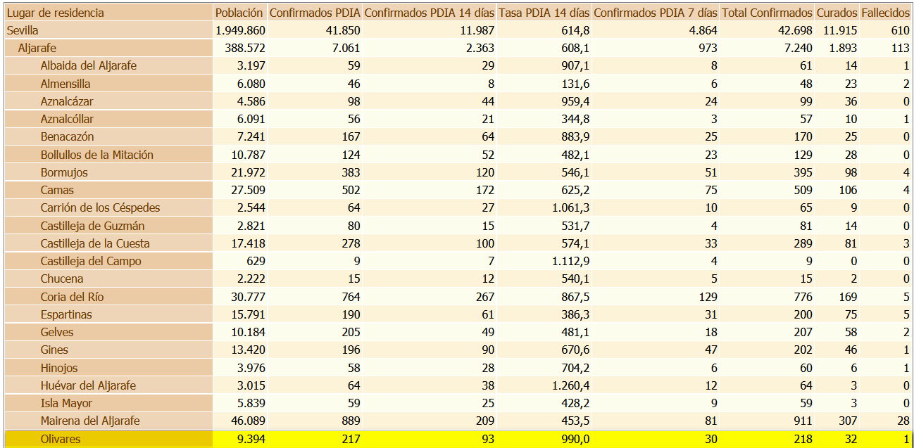Hoy martes el número de casos positivos confirmados por la Junta de Andalucía en Olivares, en los últimos catorce días, es de 93 casos.