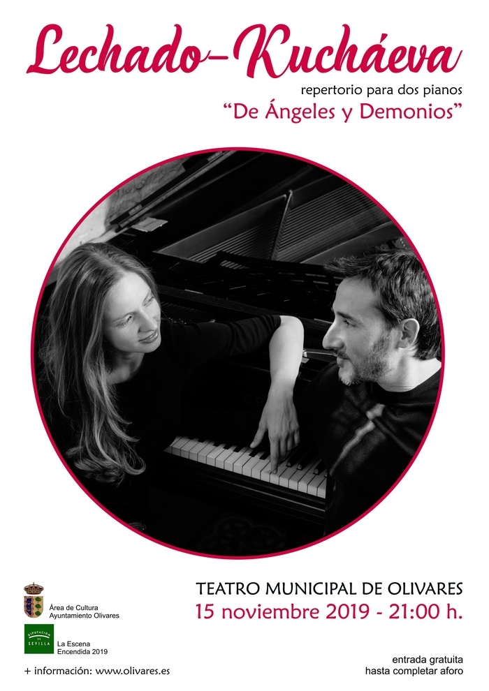 El viernes 15 de noviembre a las 21 horas en el Teatro Municipal de Olivares, NATALIA KUCHÁEVA, pianista y maestra repetidora del Teatro de la Maestranza de Sevilla y JORGE LECHADO, Catedrático de Piano del CSM Manuel Castillo de Sevilla nos ofrecerán ?DE ÁNGELES Y DEMONIOS?, un programa lleno de contrastes y emociones, de brillos y sombras, una experiencia que no les dejará indiferentes?