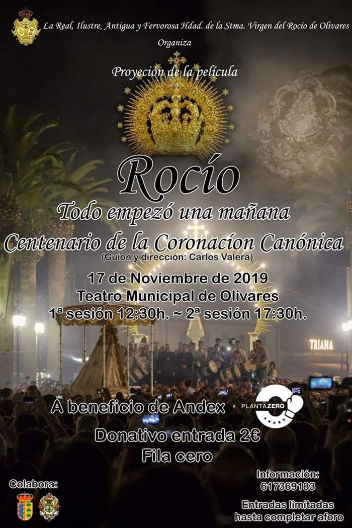 El domingo 17 de noviembre, a las 12:30 y 17:30 horas, en el Teatro Municipal, la Hermandad del Rocío de Olivares organiza la proyección de la película "ROCÍO. TODO EMPEZÓ UNA MAÑANA. CENTENARIO DE LA CORONACIÓN CANÓNICA", a beneficio del proyecto de #Andex#PlantaZero con el que las Hermandades del Rocío están comprometidas y la colaboración del Ayuntamiento de Olivares.