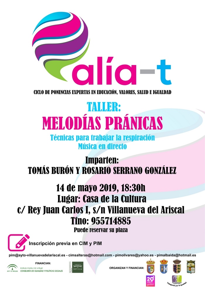 El próximo martes 14 de mayo tendrá lugar el "Taller: Melodías pránicas", una actividad que aborda técnicas para la mejora de la salud, a través de la respiración y la música. Esta actividad se desarrollará en la Casa de la Cultura del Ayuntamiento de Villanueva del Ariscal, a cargo del personal experto: Tomás Burón y Rosario Serrano González.