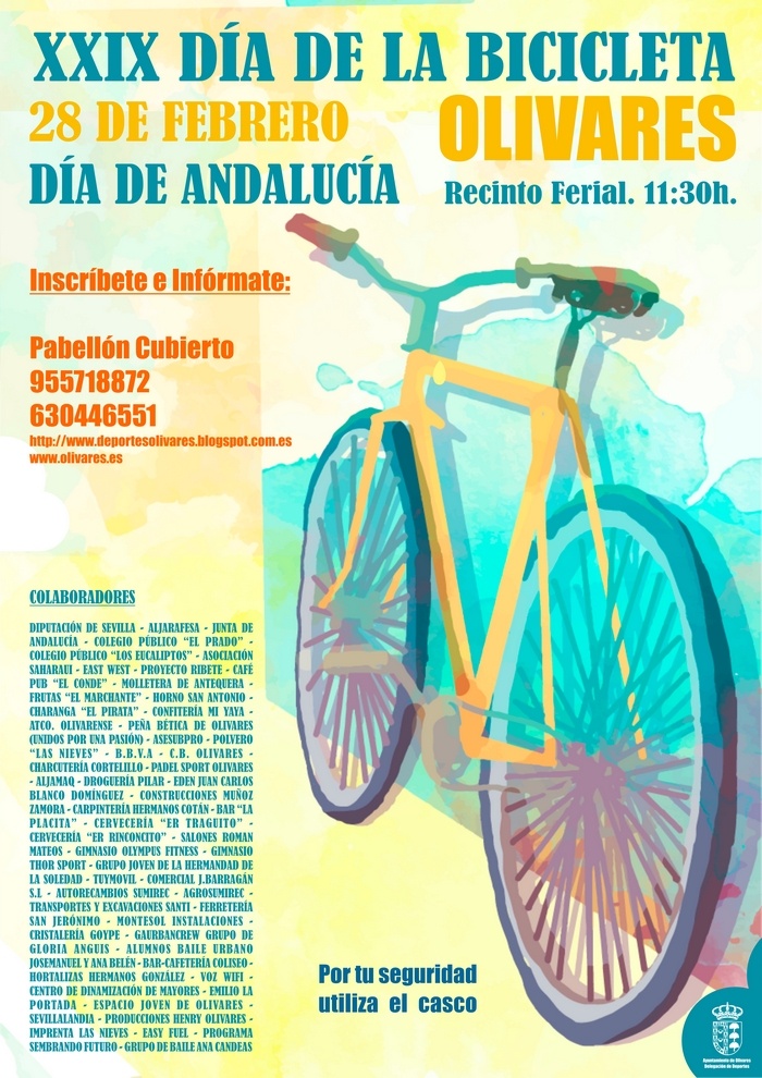 Como todos los años atrás, desde el Área de Deportes del Ayuntamiento de Olivares queremos anunciar que el próximo 28 de febrero, "DÍA DE ANDALUCÍA", tendrá lugar la XXIX DÍA DE LA BICICLETA.