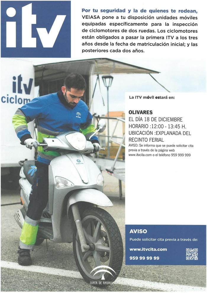 El Ayuntamiento de Olivares informa que el día 18 de diciembre, a partir de las 12 de la mañana y hasta las 13:45 horas, se encontrará en el Recinto Ferial de Olivares la Estación Móvil de la ITV de Ciclomotores para que puedan pasar la revisión a la que están obligados por ley.