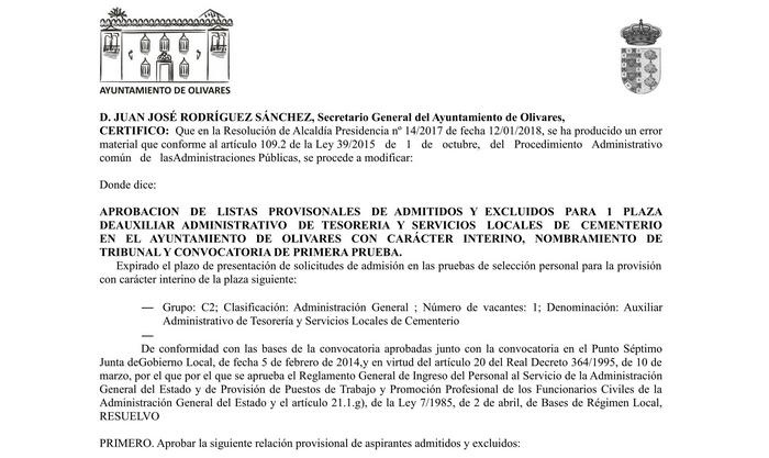 APROBACION DE LISTAS PROVISONALES DE ADMITIDOS Y EXCLUIDOS PARA 1 PLAZA DE AUXILIAR ADMINISTRATIVO DE TESORERIA Y SERVICIOS LOCALES DE CEMENTERIO EN EL AYUNTAMIENTO DE OLIVARES CON CARÁCTER INTERINO, NOMBRAMIENTO DE TRIBUNAL Y CONVOCATORIA DE PRIMERA PRUEBA