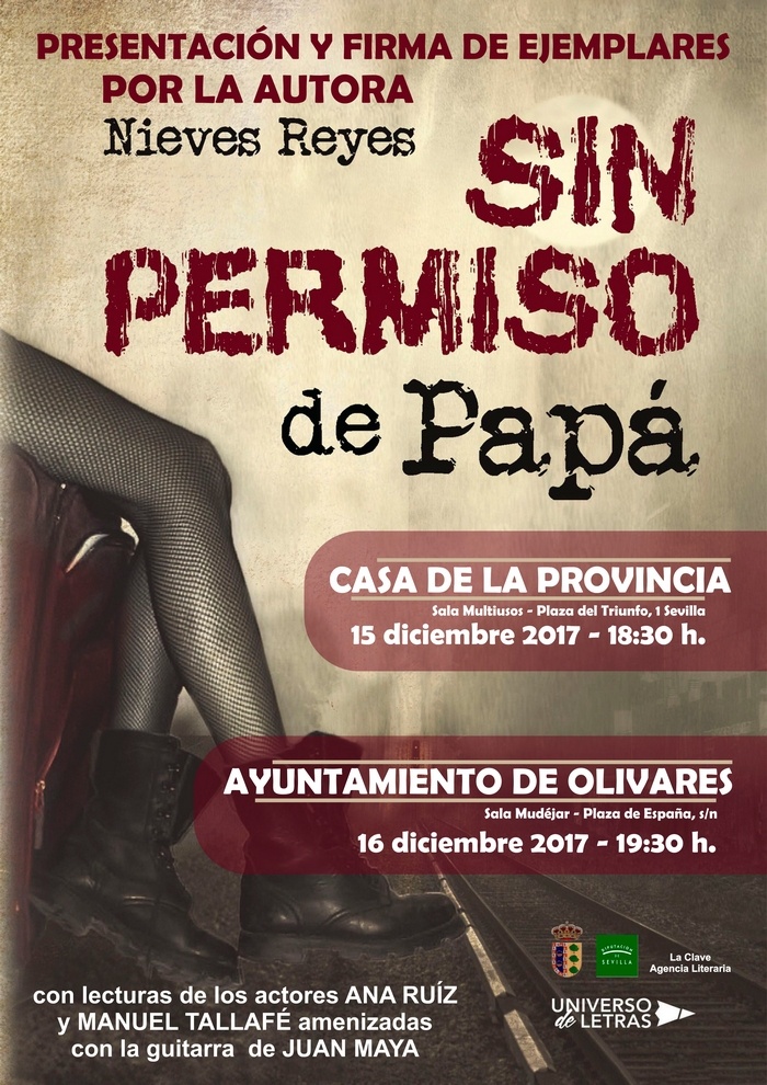 El viernes 15 de diciembre a las 18:30 horas en la Casa de la Provincia (Plaza del Triunfo, 1 Sevilla) y el sábado 16 a las 19:30 horas en el Ayuntamiento de Olivares, Nieves Reyes Pallares nos presenta su novela "Sin permiso de papá".