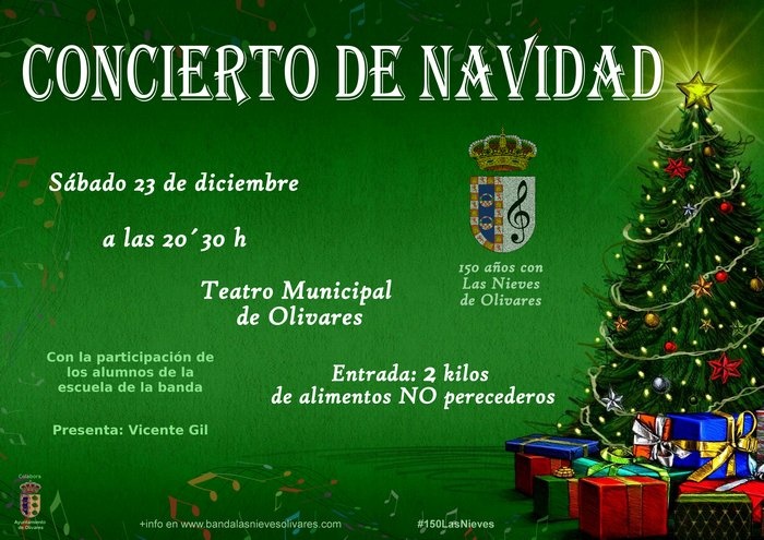 El 23 de diciembre, a las 20:30 horas, en el Teatro Municipal de Olivares se celebrará el tradicional Concierto de Navidad organizado por la Banda Las Nieves y patrocinado por el Ayuntamiento de Olivares. Entrada: 2 kilos de alimentos no perecederos.