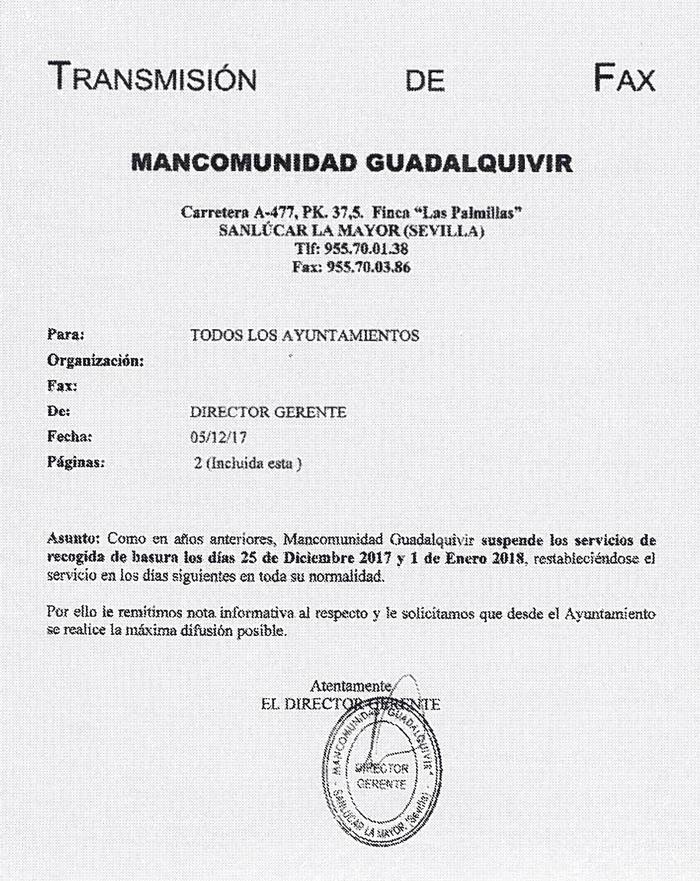 Como en años anteriores, la Mancomunidad "Guadalquivir", encargada de la prestación del servicio público de recogida de basura en todos los municipios de la comarca del Aljarafe, ha comunicado oficialmente a los Ayuntamientos afectados, que en las fiestas navideñas se suspende el servicio durante los días más señalados.