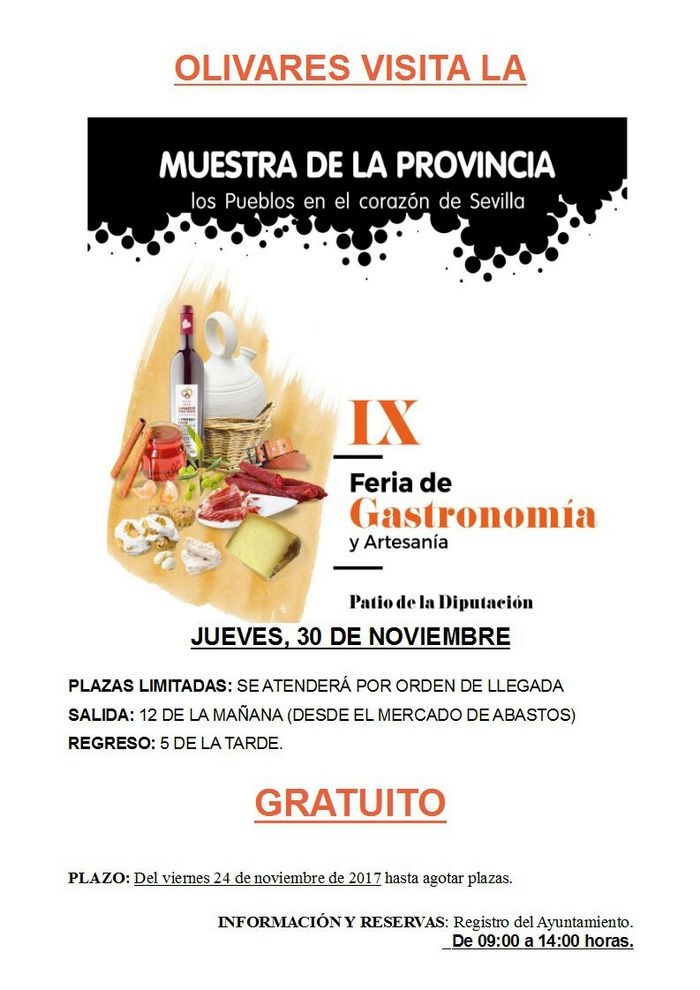El jueves 30 de noviembre Olivares visitará la IX Muestra de Gastronomía y Artesanía que se celebra en Patio de la Diputación de Sevilla. La salida es a las 12 de la mañana desde el Mercado de Abastos y el regreso a las 5 de la tarde. Pueden recoger las entradas de forma gratuita a partir de mañana viernes 24 de noviembre hasta agotar plazas.