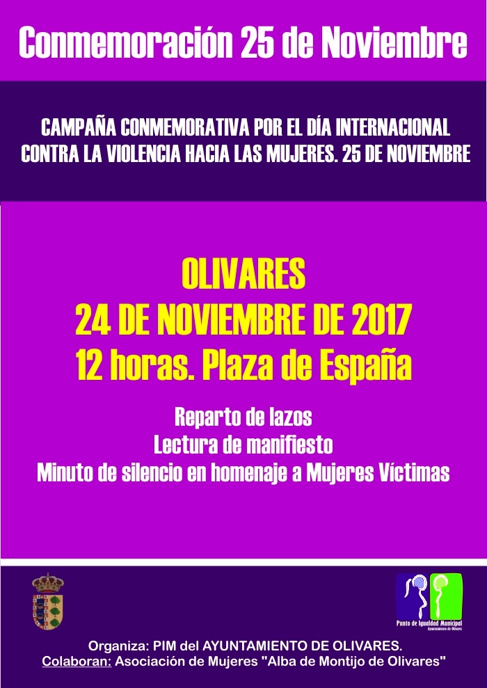 Hoy día 24 de Noviembre de 2017 tendrán lugar los actos conmemorativos para la campaña por el Día Internacional contra la violencia hacia las mujeres. Un día de manifestación por la repulsa y el asesinato de todas las mujeres en manos de sus parejas y exparejas; así como de los hijos e hijas víctimas de esta violencia.
