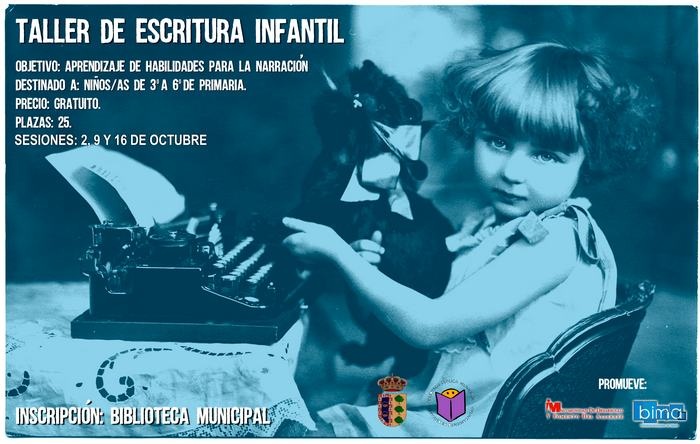 Durante los días 2, 9 y 16 de Octubre (Lunes) se llevará a cabo un Taller de Escritura Infantil, dirigido a niños y niñas de 3º a 6º de primaria que comienzan a interesarse de forma autónoma por la lectura y, especialmente, a aquellos que disfrutan inventando y jugando con las historias.