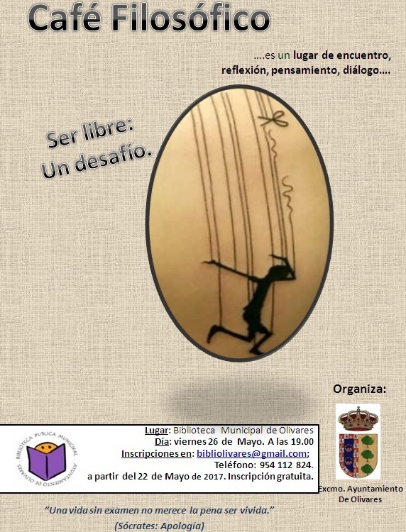 Es un lugar de encuentro, reflexión, pensamiento, diálogo... Este mes clausuramos el curso con el tema "Ser libre: un desafío". Con Pepe Fuentes. Viernes 26 de mayo a las 19 horas en la Biblioteca Pública Municipal de Olivares.