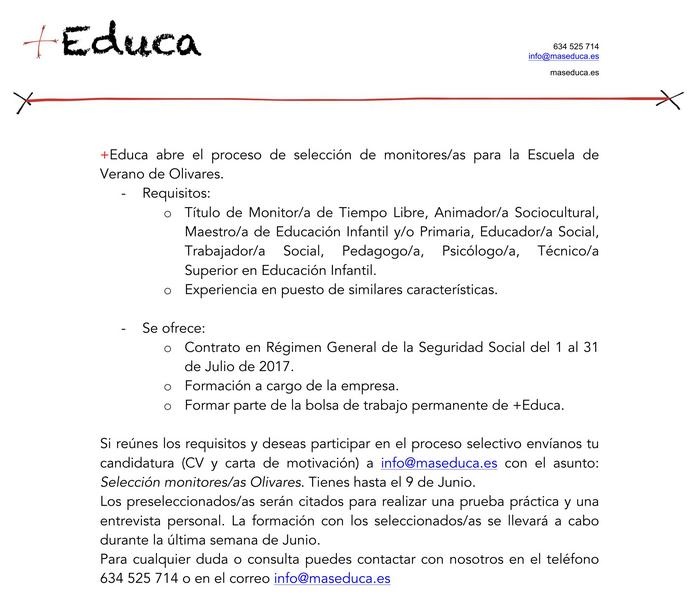 La empresa +Educa encargada de la planificación e implementación de la Escuela de Verano Municipal 2017, proyecto gestionado por el Área de Bienestar Social del Ayuntamiento y promovido por el Área de Ciudadanía y Cultura de la Diputación de Sevilla para la promoción de Valores Cívicos y Ciudadanos en la Infancia, abre el plazo de presentación de solicitudes-candidaturas hasta el 9 de junio para la selección del personal monitor.