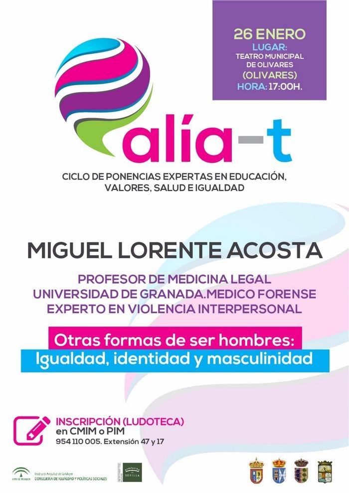 El próximo día 26 de enero a las 17 horas, el Teatro Municipal de Olivares albergará la segunda ponencia del nuevo proyecto ALIA-t , que contará con la Ponencia Experta del Médico Forense, Profesor en Medicina Legal de la Universidad de Granada y Experto en Violencia Interpersonal, D. Miguel Lorente Acosta. Con una ponencia dirigida a hombres y mujeres: "Otras formas de ser hombres: Igualdad, Identidad y Masculinidad",