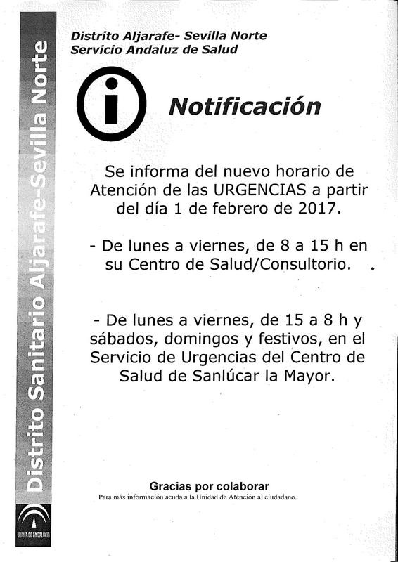 El Servicio Andaluz de Salud ha comunicado oficialmente al Ayuntamiento de Olivares el nuevo horario del servicio de atención a las urgencias, y que comienza a aplicarse a partir del día 1 de febrero de 2017.