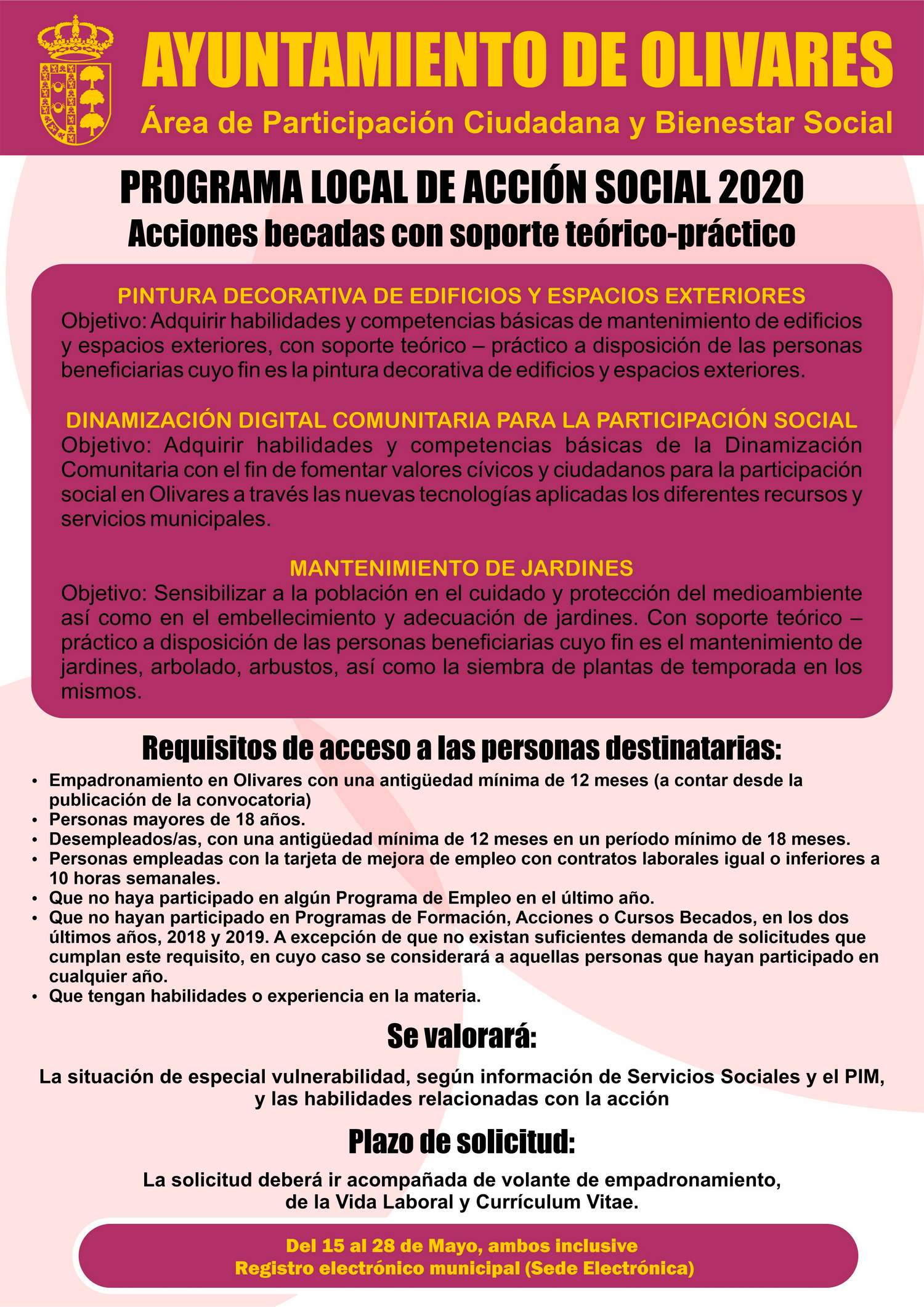 - Empadronamiento en Olivares con una antigüedad mínima de 12 meses (a contar desde la publicación de la convocatoria)