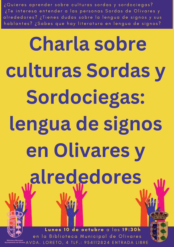 El próximo lunes 10 de octubre en la Biblioteca tenemos una charla sobre Cultura Sorda con Cristina Torres, vecina de Olivares, amante de su profesión y de la lengua de signos.