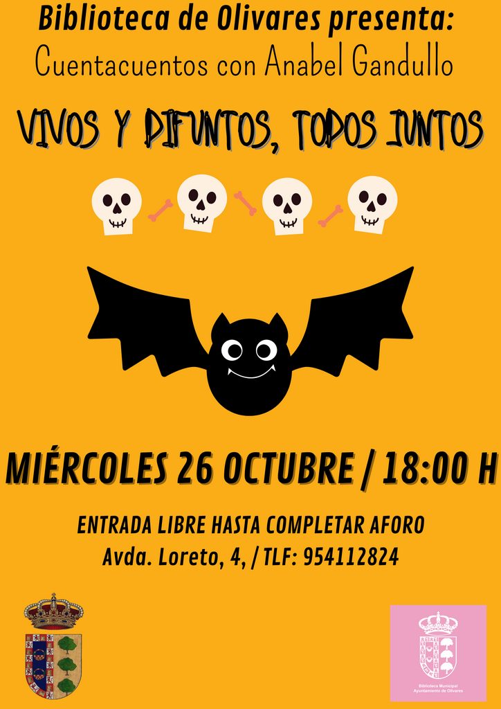 El miércoles 26 de octubre a las 18 horas en la Biblioteca Municipal de Olivares, Cuentacuentos de Halloween con Anabel Gandullo. "Vivos y difuntos, todos juntos".