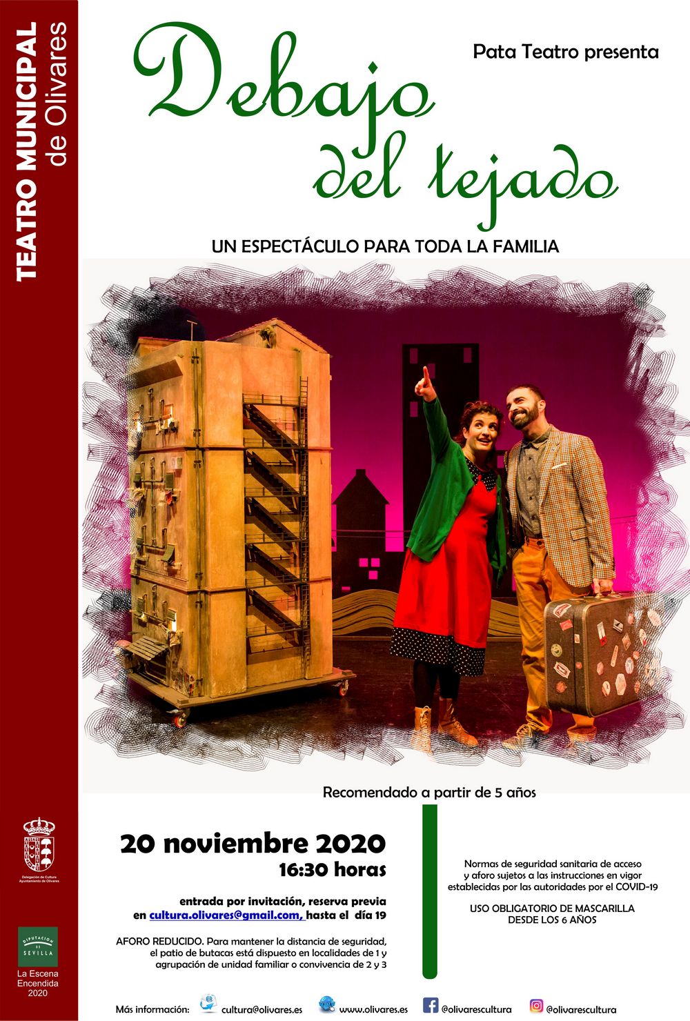 Pata Teatro representará el viernes 20 de noviembre, a las 16:30 horas en el Teatro Municipal de Olivares, la obra "Debajo del tejado". Recomendada a partir de 5 años. Entrada por invitación.