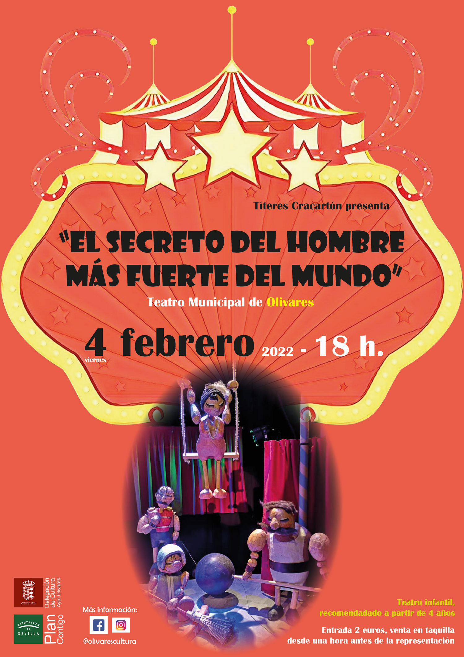 Títeres Caracartón nos presenta el viernes 4 de febrero, a las 6 de la tarde, en el Teatro Municipal de Olivares la obra de teatro infantil “El secreto del hombre más fuerte del mundo”.