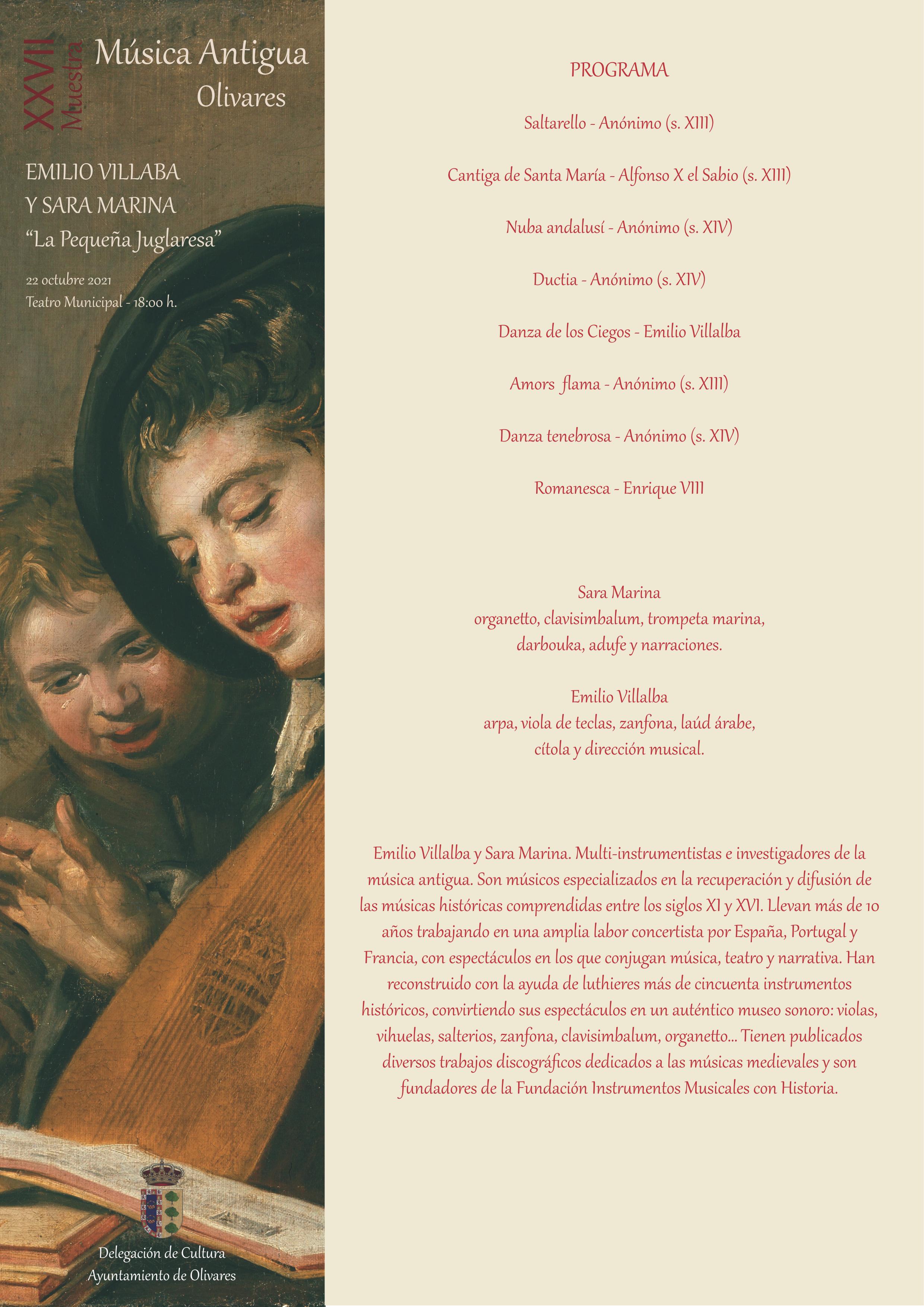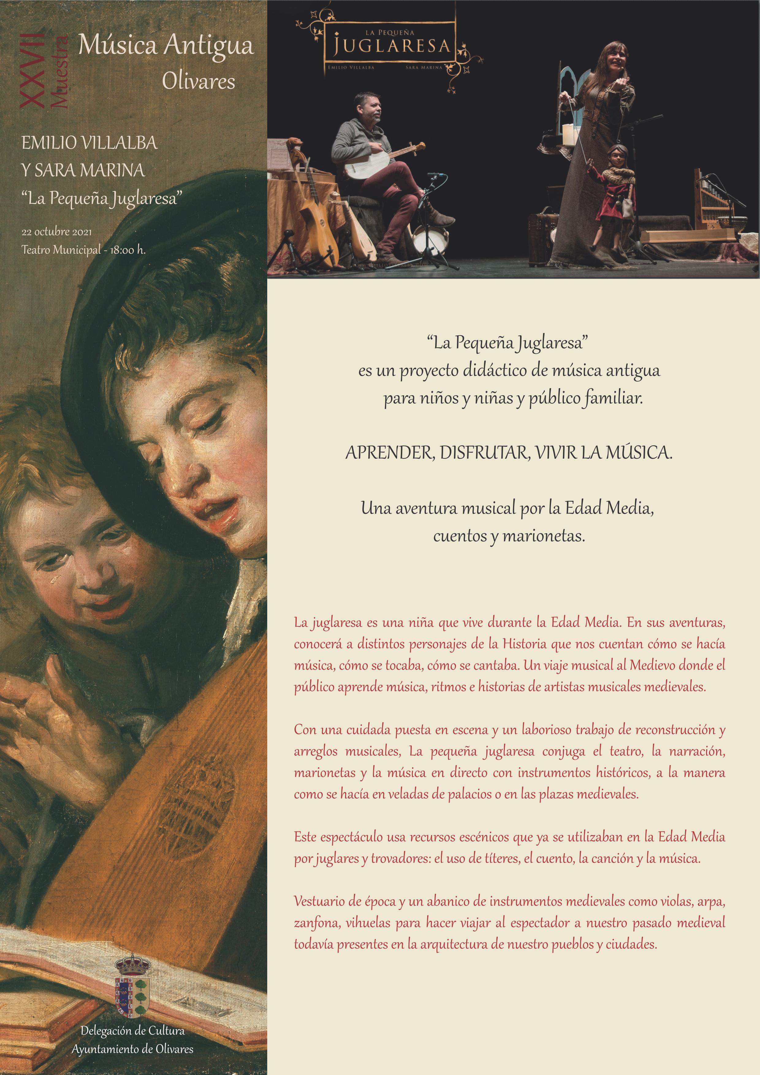 - Viernes 22 de octubre: EMILIO VILLALBA Y SARA MARINA: “La Pequeña Juglaresa”. Teatro Municipal de Olivares - 18:00 h. Es un proyecto didáctico de música antigua para niños y niñas y público familiar, una aventura musical por la Edad Media, cuentos y marionetas. Aprender, disfrutar, vivir la música.