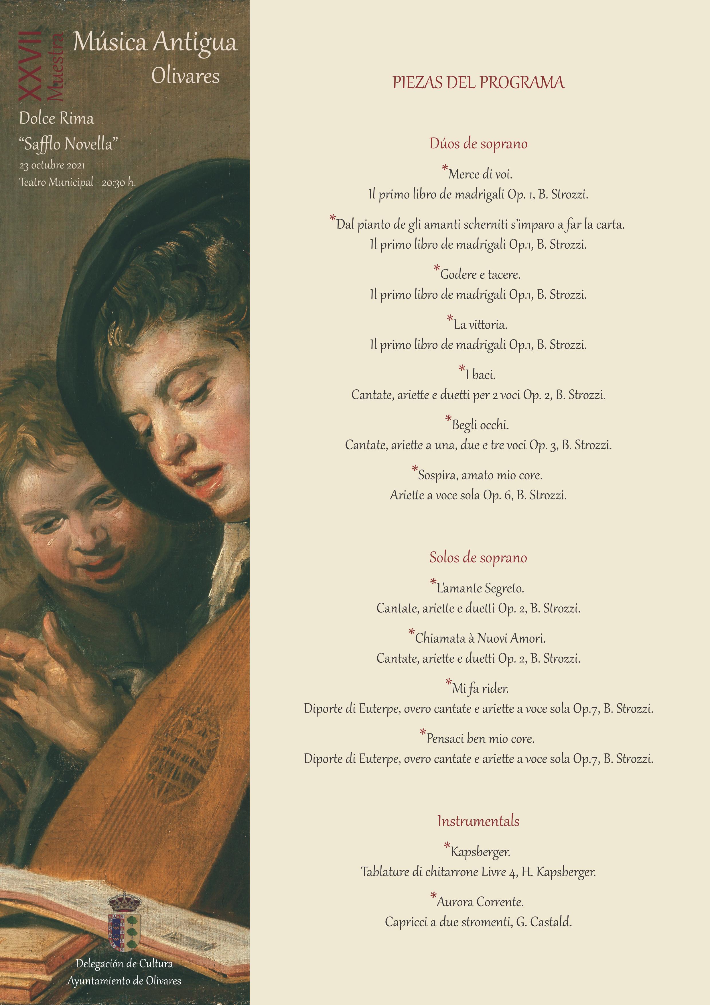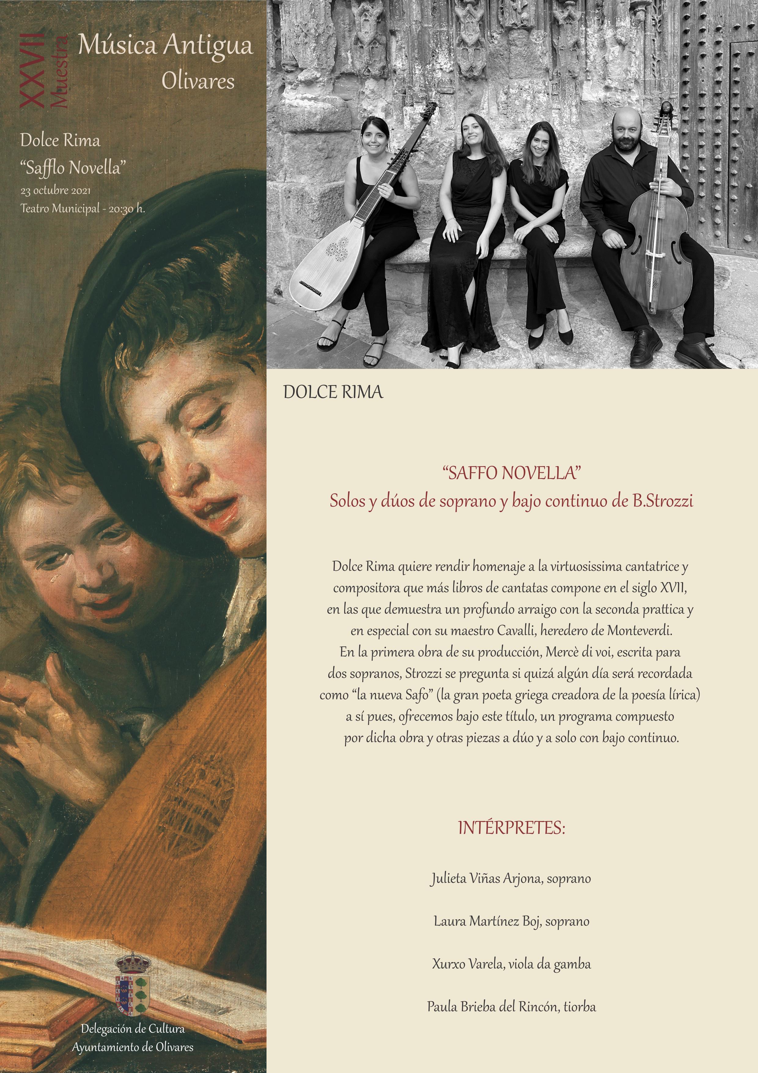 - Sábado 23 de octubre: DOLCE RIMA: “SAFFO NOVELLA”. Solos y dúos de soprano y bajo continuo de B.Strozzi. Teatro Municipal de Olivares - 20:30 h. Dolce Rima quiere rendir homenaje a la virtuosissima cantatrice y compositora que más libros de cantatas compone en el siglo XVII, en las que demuestra un profundo arraigo con la seconda prattica y en especial con su maestro Cavalli, heredero de Monteverdi.