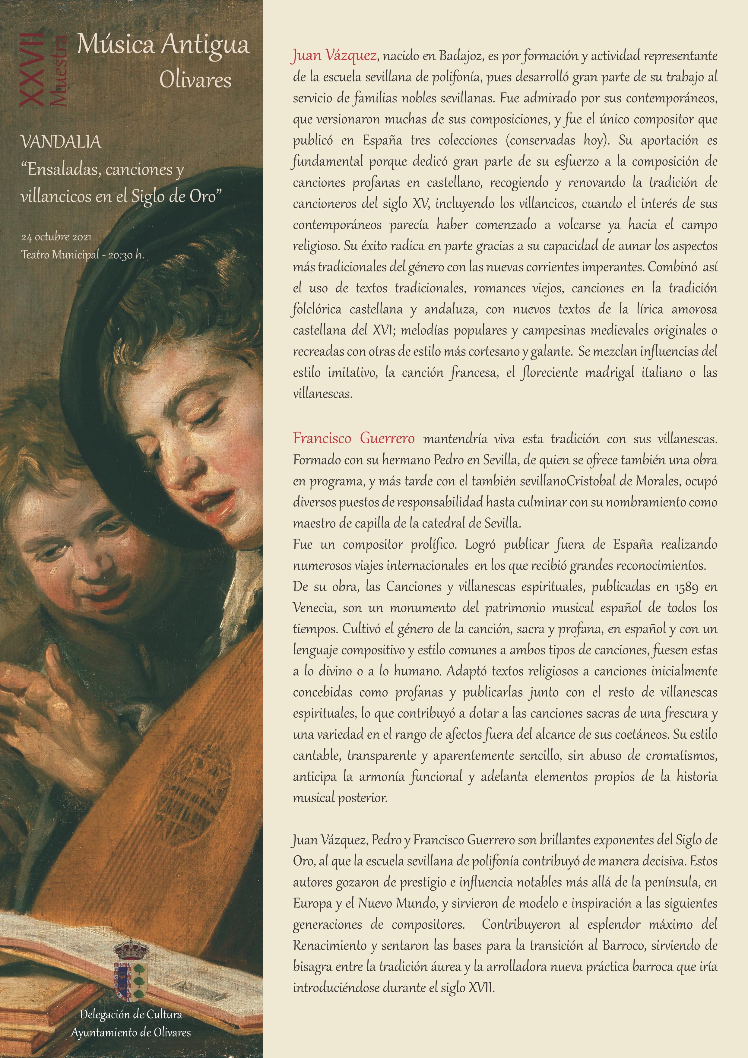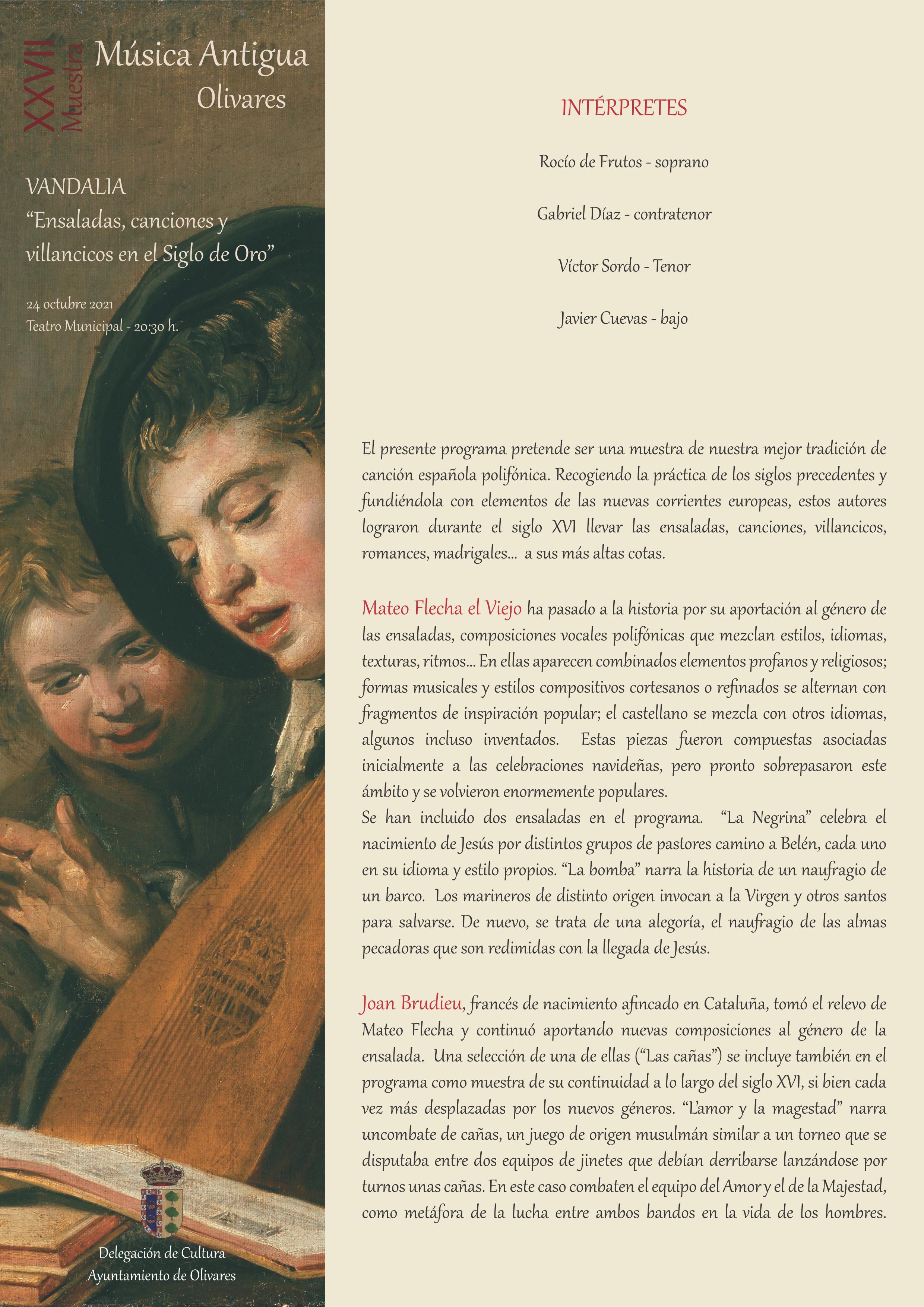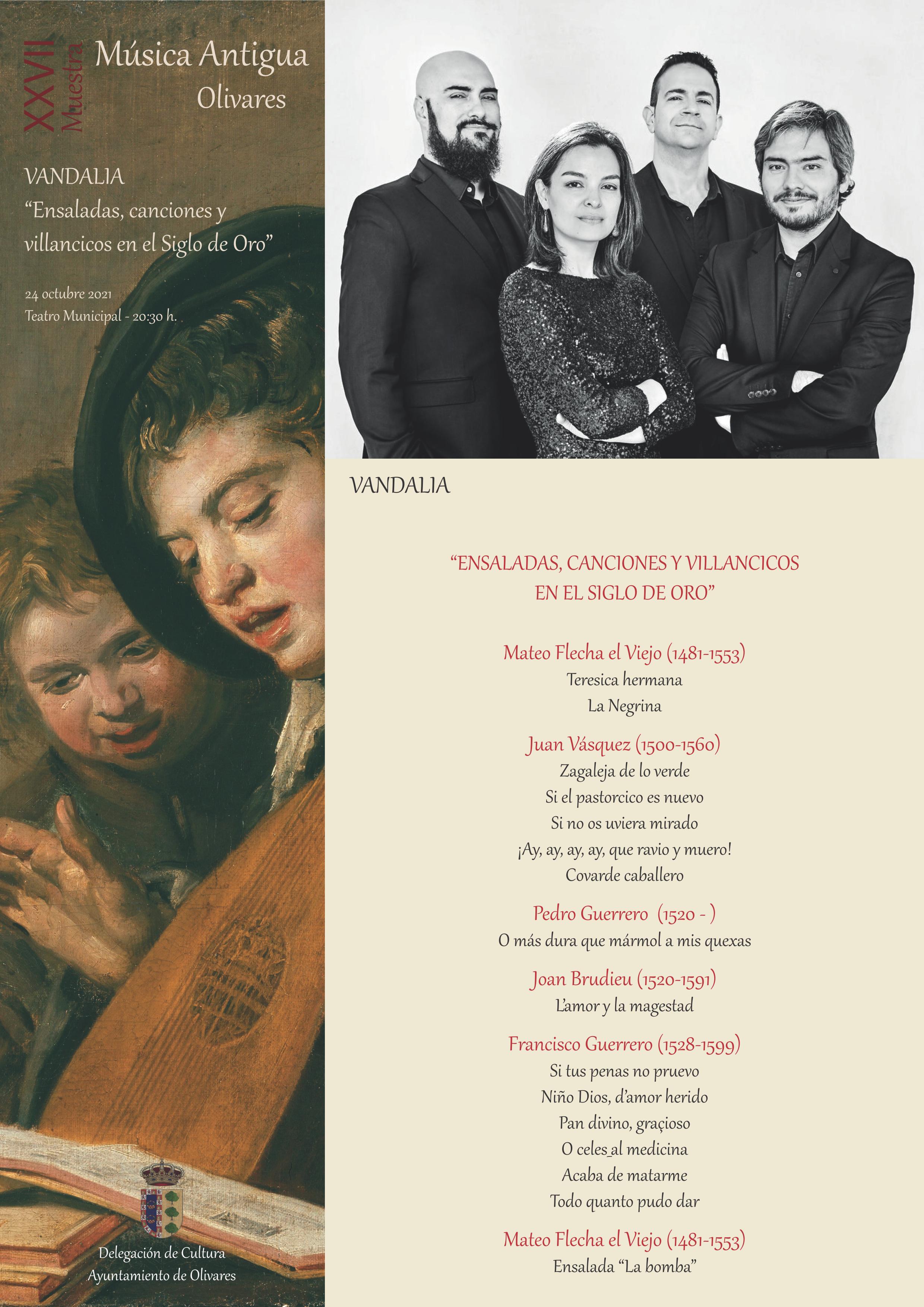 - Domingo 24 de octubre: VANDALIA: “Ensaladas, canciones y villancicos en el Siglo de Oro”. Teatro Municipal de Olivares - 20:30 h.