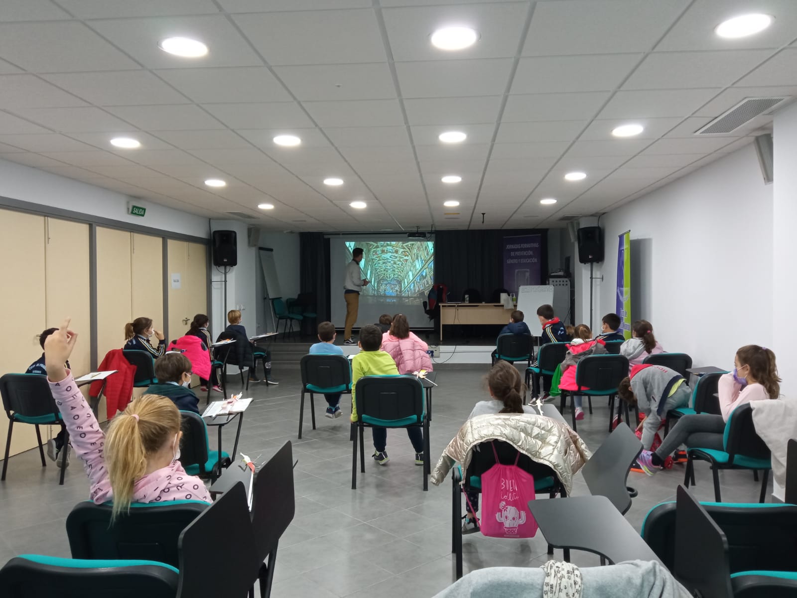 El autor animó a los niños-as a leer, dibujar y escribir, haciendo volar su imaginación. Incluso nos sorprendió con algún "baile puntillista" y con la creación de una misteriosa papelera devora papeles.