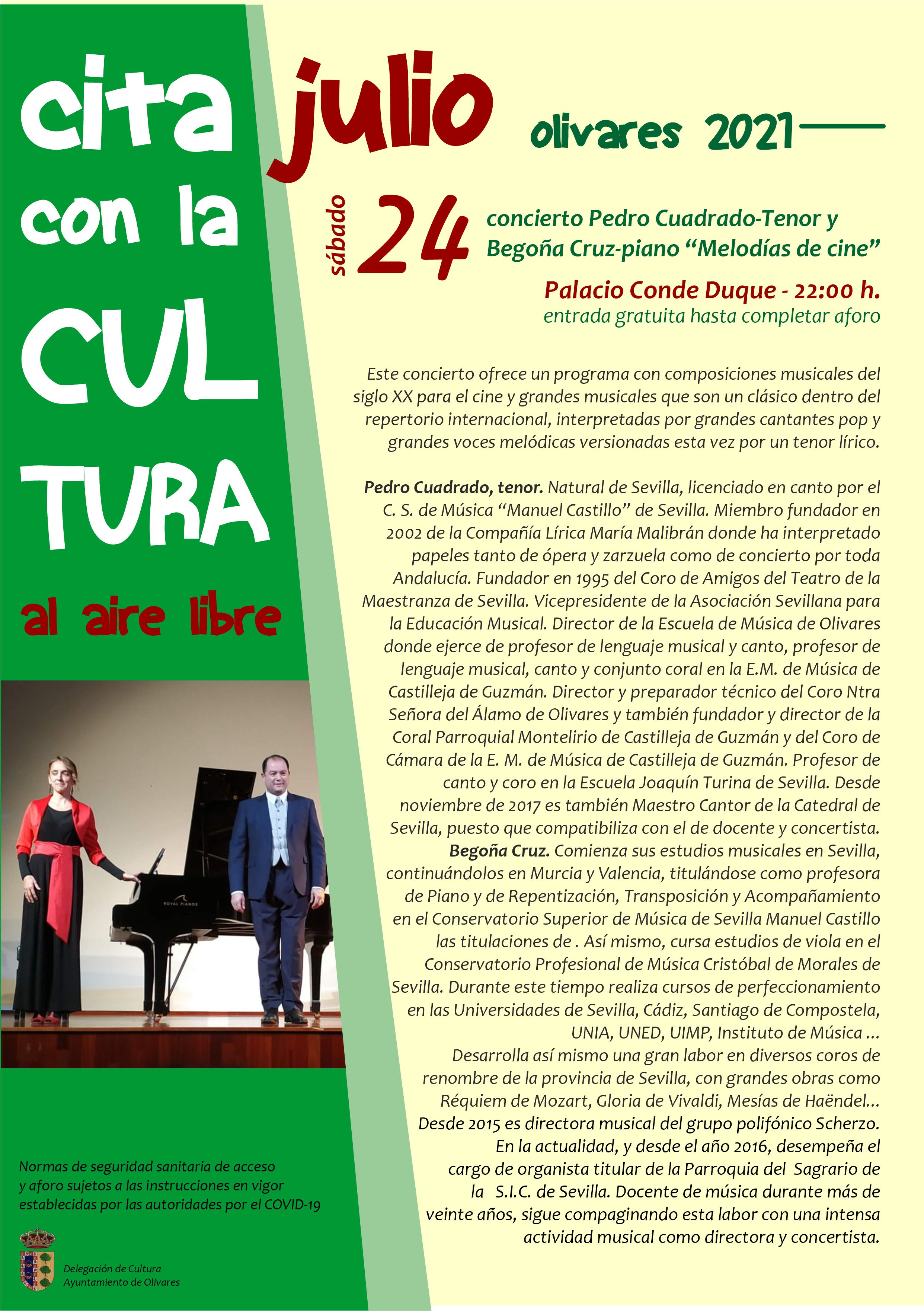 El próximo 24 de julio a las 22:000 horas en el patio del Palacio del Conde Duque de Olivares podremos disfrutar de una noche inolvidable a través de composiciones para el cine y grandes musicales que ya son un clásico, versionadas esta vez por un tenor lírico.
