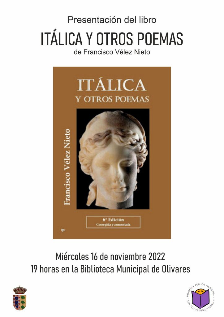 El miércoles 16 de noviembre de 2022 a las 19:00 horas, en la Biblioteca Pública Municipal tendrá lugar la presentación del poemario de Francisco Vélez Nieto "Itálica y otros poemas".