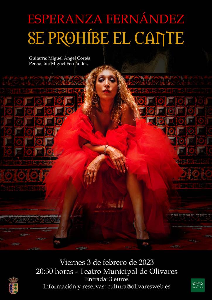 El viernes día 3 de febrero a las 20:30 horas, tendrá lugar en el Teatro Municipal de Olivares el recital flamenco "Se prohíbe el cante" a cargo de Esperanza Fernández. Precio: 3 euros. Reserva de entradas: cultura@olivaresweb.es