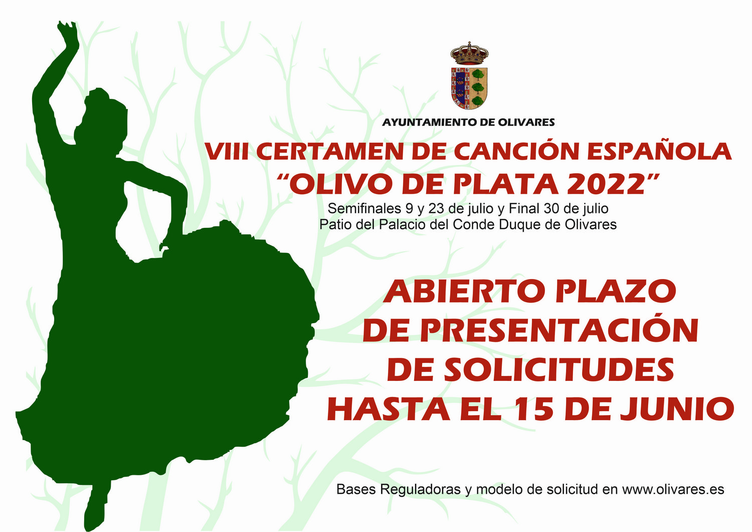 La Delegación de Cultura del Ayuntamiento de Olivares organiza el VIII Certamen de Canción Española “Olivo de Plata” con el objetivo de impulsar y difundir el género musical de la copla y canción española que tiene un importante arraigo en nuestro pueblo.