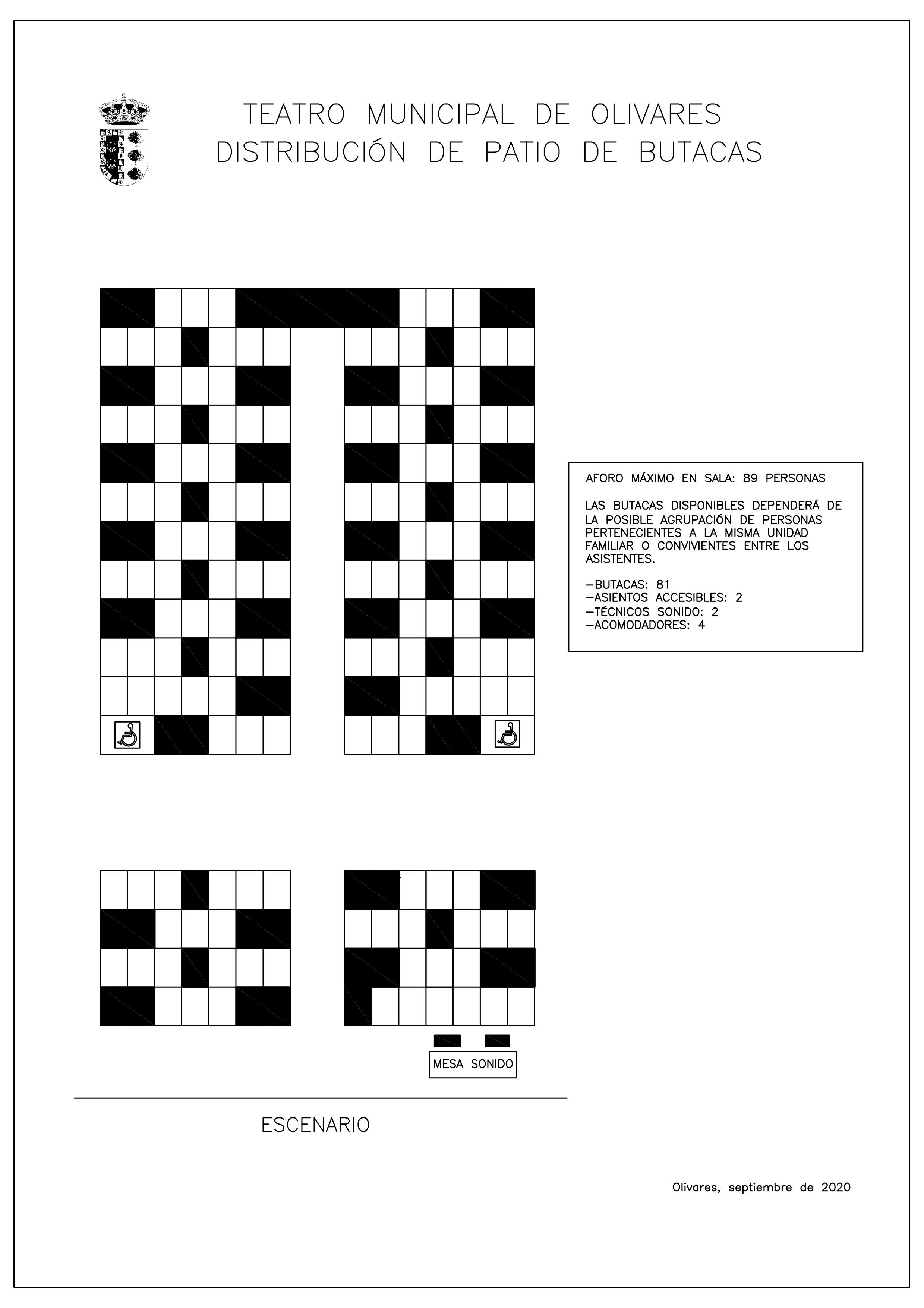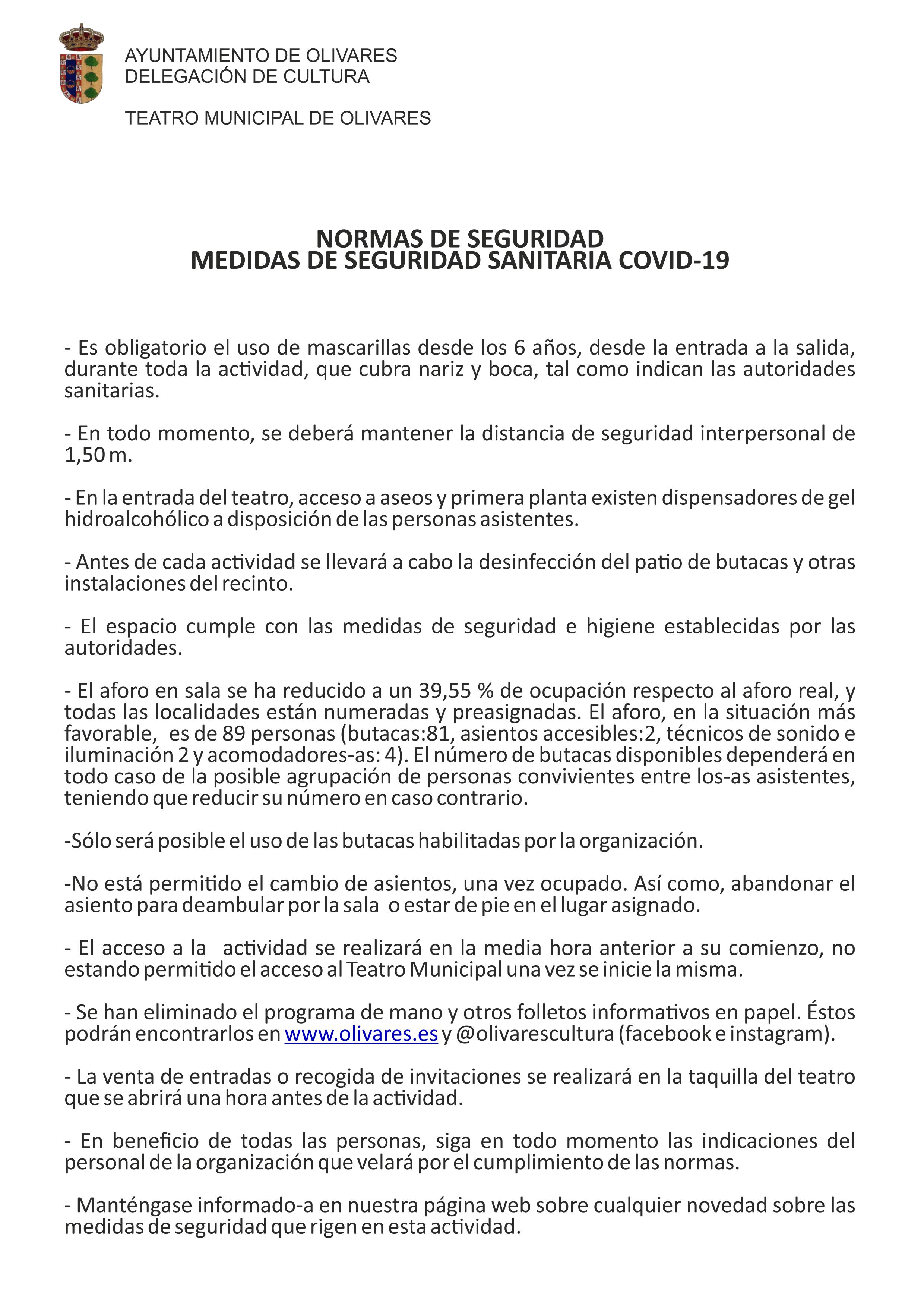 A la presentación de esta actividad se adjunta el programa de mano de la misma, las Medidas Generales COVID-19 extraídas del Protocolo de Actuación y Prevención frente al COVID-19 y el plano del aforo y distribución del patio de butacas del Teatro Municipal de Olivares.