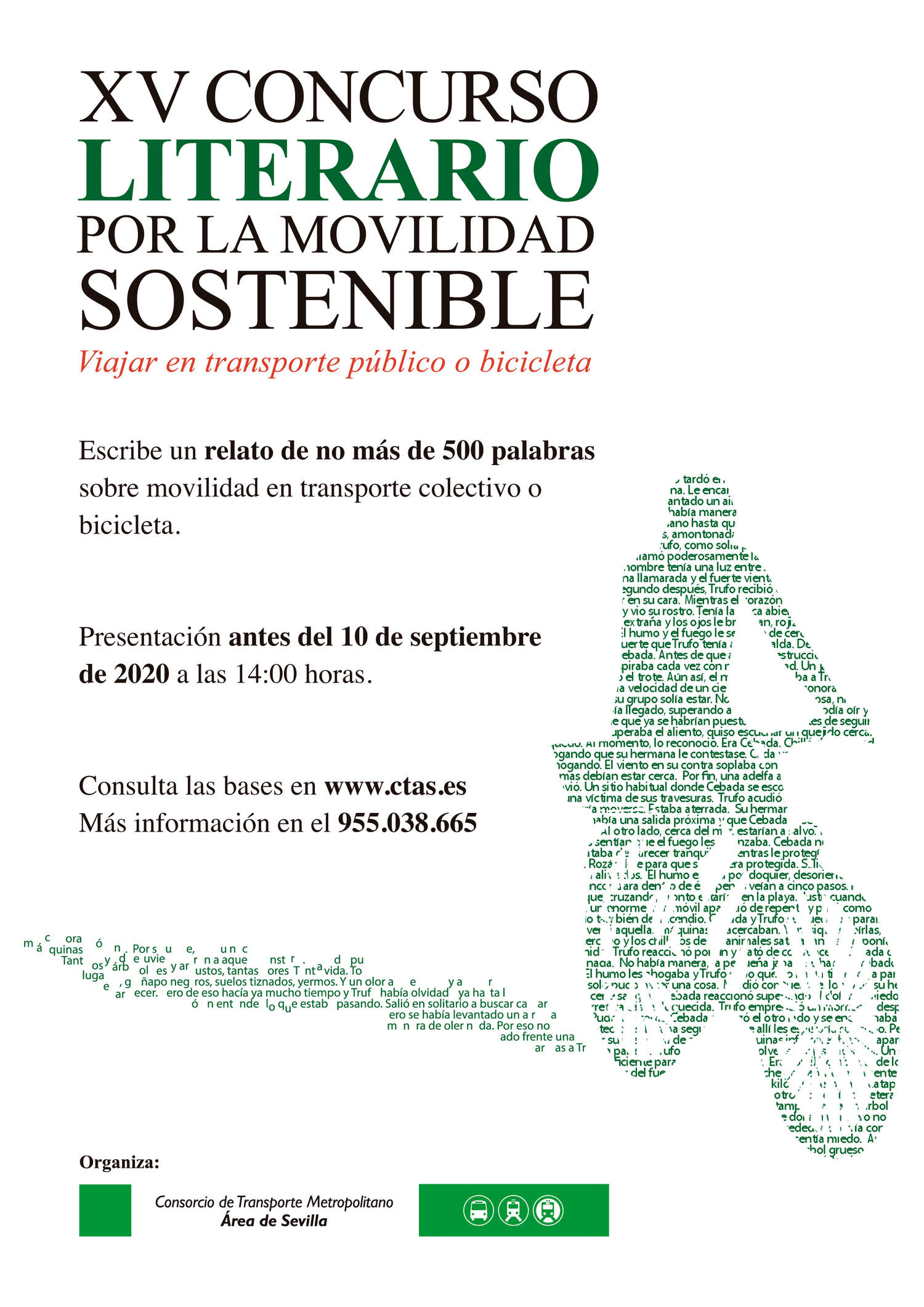 Un año más y este 2020 con más motivo si cabe, convocamos la XV edición de nuestro certamen literario “VIAJAR EN TRANSPORTE PÚBLICO O EN BICICLETA, EN 500 PALABRAS”, que se enmarca dentro de las actividades conmemorativas de la Semana Europea de la Movilidad, que anualmente se celebra entre los días 16 y 22 de septiembre.
