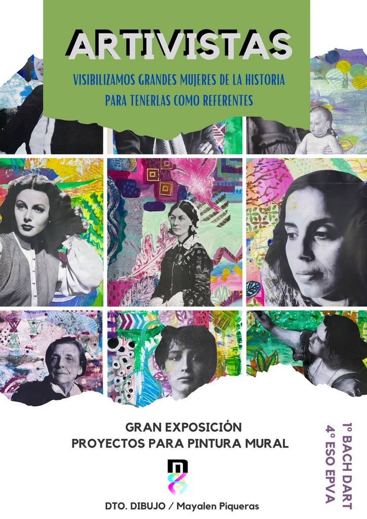La Exposición ARTIVISTAS visibiliza grandes mujeres de la historia para tenerlas como referentes. Se trata de un amplio Proyecto de Pintura Mural, elaborado por los grupos de 1º de Bachillerato y 4º de la ESO del IES Heliche de Olivares, con la coordinación del Departamento de Dibujo y la profesora Mayalen Piqueras.